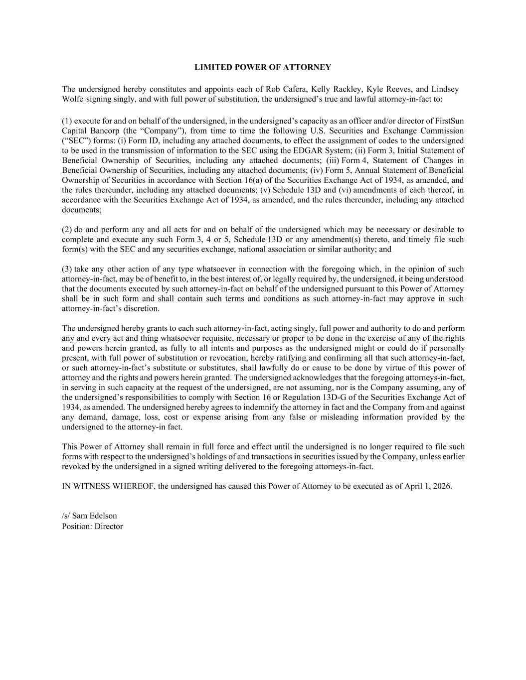 LIMITED POWER OF ATTORNEY The undersigned hereby constitutes and appoints each of Rob Cafera, Kelly Rackley, Kyle Reeves, and Lindsey Wolfe signing singly, and with full power of substitution, the undersigned’s true and lawful attorney-in-fact to: (1) execute for and on behalf of the undersigned, in the undersigned’s capacity as an officer and/or director of FirstSun Capital Bancorp (the “Company”), from time to time the following U.S. Securities and Exchange Commission (“SEC”) forms: (i) Form ID, including any attached documents, to effect the assignment of codes to the undersigned to be used in the transmission of information to the SEC using the EDGAR System; (ii) Form 3, Initial Statement of Beneficial Ownership of Securities, including any attached documents; (iii) Form 4, Statement of Changes in Beneficial Ownership of Securities, including any attached documents; (iv) Form 5, Annual Statement of Beneficial Ownership of Securities in accordance with Section 16(a) of the Securities Exchange Act of 1934, as amended, and the rules thereunder, including any attached documents; (v) Schedule 13D and (vi) amendments of each thereof, in accordance with the Securities Exchange Act of 1934, as amended, and the rules thereunder, including any attached documents; (2) do and perform any and all acts for and on behalf of the undersigned which may be necessary or desirable to complete and execute any such Form 3, 4 or 5, Schedule 13D or any amendment(s) thereto, and timely file such form(s) with the SEC and any securities exchange, national association or similar authority; and (3) take any other action of any type whatsoever in connection with the foregoing which, in the opinion of such attorney-in-fact, may be of benefit to, in the best interest of, or legally required by, the undersigned, it being understood that the documents executed by such attorney-in-fact on behalf of the undersigned pursuant to this Power of Attorney shall be in such form and shall contain such terms and conditions as such attorney-in-fact may approve in such attorney-in-fact’s discretion. The undersigned hereby grants to each such attorney-in-fact, acting singly, full power and authority to do and perform any and every act and thing whatsoever requisite, necessary or proper to be done in the exercise of any of the rights and powers herein granted, as fully to all intents and purposes as the undersigned might or could do if personally present, with full power of substitution or revocation, hereby ratifying and confirming all that such attorney-in-fact, or such attorney-in-fact’s substitute or substitutes, shall lawfully do or cause to be done by virtue of this power of attorney and the rights and powers herein granted. The undersigned acknowledges that the foregoing attorneys-in-fact, in serving in such capacity at the request of the undersigned, are not assuming, nor is the Company assuming, any of the undersigned’s responsibilities to comply with Section 16 or Regulation 13D-G of the Securities Exchange Act of 1934, as amended. The undersigned hereby agrees to indemnify the attorney in fact and the Company from and against any demand, damage, loss, cost or expense arising from any false or misleading information provided by the undersigned to the attorney-in fact. This Power of Attorney shall remain in full force and effect until the undersigned is no longer required to file such forms with respect to the undersigned’s holdings of and transactions in securities issued by the Company, unless earlier revoked by the undersigned in a signed writing delivered to the foregoing attorneys-in-fact. IN WITNESS WHEREOF, the undersigned has caused this Power of Attorney to be executed as of April 1, 2026. /s/ Sam Edelson Position: Director