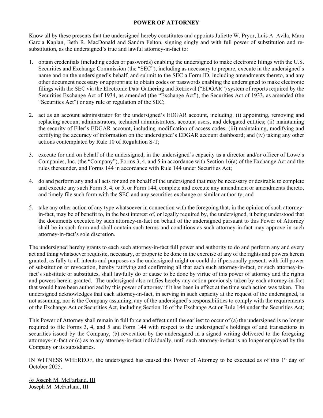 POWER OF ATTORNEY Know all by these presents that the undersigned hereby constitutes and appoints Juliette W. Pryor, Luis A. Avila, Mara Garcia Kaplan, Beth R. MacDonald and Sandra Felton, signing singly and with full power of substitution and re- substitution, as the undersigned’s true and lawful attorney-in-fact to: 1. obtain credentials (including codes or passwords) enabling the undersigned to make electronic filings with the U.S. Securities and Exchange Commission (the “SEC”), including as necessary to prepare, execute in the undersigned’s name and on the undersigned’s behalf, and submit to the SEC a Form ID, including amendments thereto, and any other document necessary or appropriate to obtain codes or passwords enabling the undersigned to make electronic filings with the SEC via the Electronic Data Gathering and Retrieval (“EDGAR”) system of reports required by the Securities Exchange Act of 1934, as amended (the “Exchange Act”), the Securities Act of 1933, as amended (the “Securities Act”) or any rule or regulation of the SEC; 2. act as an account administrator for the undersigned’s EDGAR account, including: (i) appointing, removing and replacing account administrators, technical administrators, account users, and delegated entities; (ii) maintaining the security of Filer’s EDGAR account, including modification of access codes; (iii) maintaining, modifying and certifying the accuracy of information on the undersigned’s EDGAR account dashboard; and (iv) taking any other actions contemplated by Rule 10 of Regulation S-T; 3. execute for and on behalf of the undersigned, in the undersigned’s capacity as a director and/or officer of Lowe’s Companies, Inc. (the “Company”), Forms 3, 4, and 5 in accordance with Section 16(a) of the Exchange Act and the rules thereunder, and Forms 144 in accordance with Rule 144 under Securities Act; 4. do and perform any and all acts for and on behalf of the undersigned that may be necessary or desirable to complete and execute any such Form 3, 4, or 5, or Form 144, complete and execute any amendment or amendments thereto, and timely file such form with the SEC and any securities exchange or similar authority; and 5. take any other action of any type whatsoever in connection with the foregoing that, in the opinion of such attorney- in-fact, may be of benefit to, in the best interest of, or legally required by, the undersigned, it being understood that the documents executed by such attorney-in-fact on behalf of the undersigned pursuant to this Power of Attorney shall be in such form and shall contain such terms and conditions as such attorney-in-fact may approve in such attorney-in-fact’s sole discretion. The undersigned hereby grants to each such attorney-in-fact full power and authority to do and perform any and every act and thing whatsoever requisite, necessary, or proper to be done in the exercise of any of the rights and powers herein granted, as fully to all intents and purposes as the undersigned might or could do if personally present, with full power of substitution or revocation, hereby ratifying and confirming all that each such attorney-in-fact, or such attorney-in- fact’s substitute or substitutes, shall lawfully do or cause to be done by virtue of this power of attorney and the rights and powers herein granted. The undersigned also ratifies hereby any action previously taken by each attorney-in-fact that would have been authorized by this power of attorney if it has been in effect at the time such action was taken. The undersigned acknowledges that each attorney-in-fact, in serving in such capacity at the request of the undersigned, is not assuming, nor is the Company assuming, any of the undersigned’s responsibilities to comply with the requirements of the Exchange Act or Securities Act, including Section 16 of the Exchange Act or Rule 144 under the Securities Act; This Power of Attorney shall remain in full force and effect until the earliest to occur of (a) the undersigned is no longer required to file Forms 3, 4, and 5 and Form 144 with respect to the undersigned’s holdings of and transactions in securities issued by the Company, (b) revocation by the undersigned in a signed writing delivered to the foregoing attorneys-in-fact or (c) as to any attorney-in-fact individually, until such attorney-in-fact is no longer employed by the Company or its subsidiaries. IN WITNESS WHEREOF, the undersigned has caused this Power of Attorney to be executed as of this 1st day of October 2025. /s/ Joseph M. McFarland, III Joseph M. McFarland, III