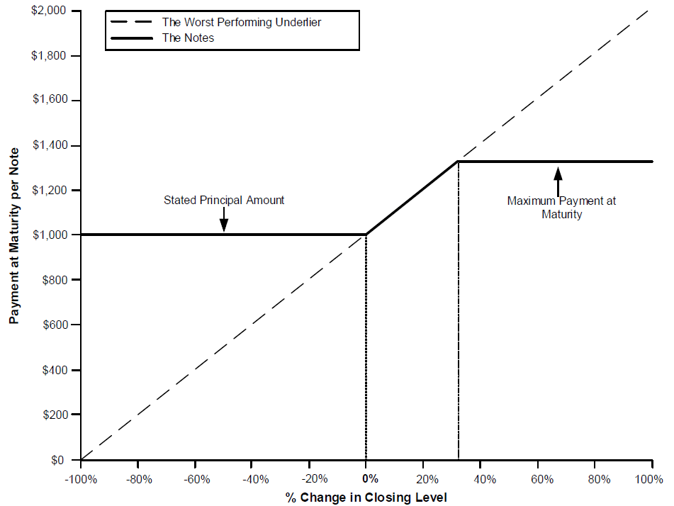 ■Upside Scenario. If the final level of the worst performing underlier is greater than its initial level, investors will receive the stated principal amount plus 100% of the appreciation of the worst performing underlier over the term of the notes, subject to the maximum payment at maturity.