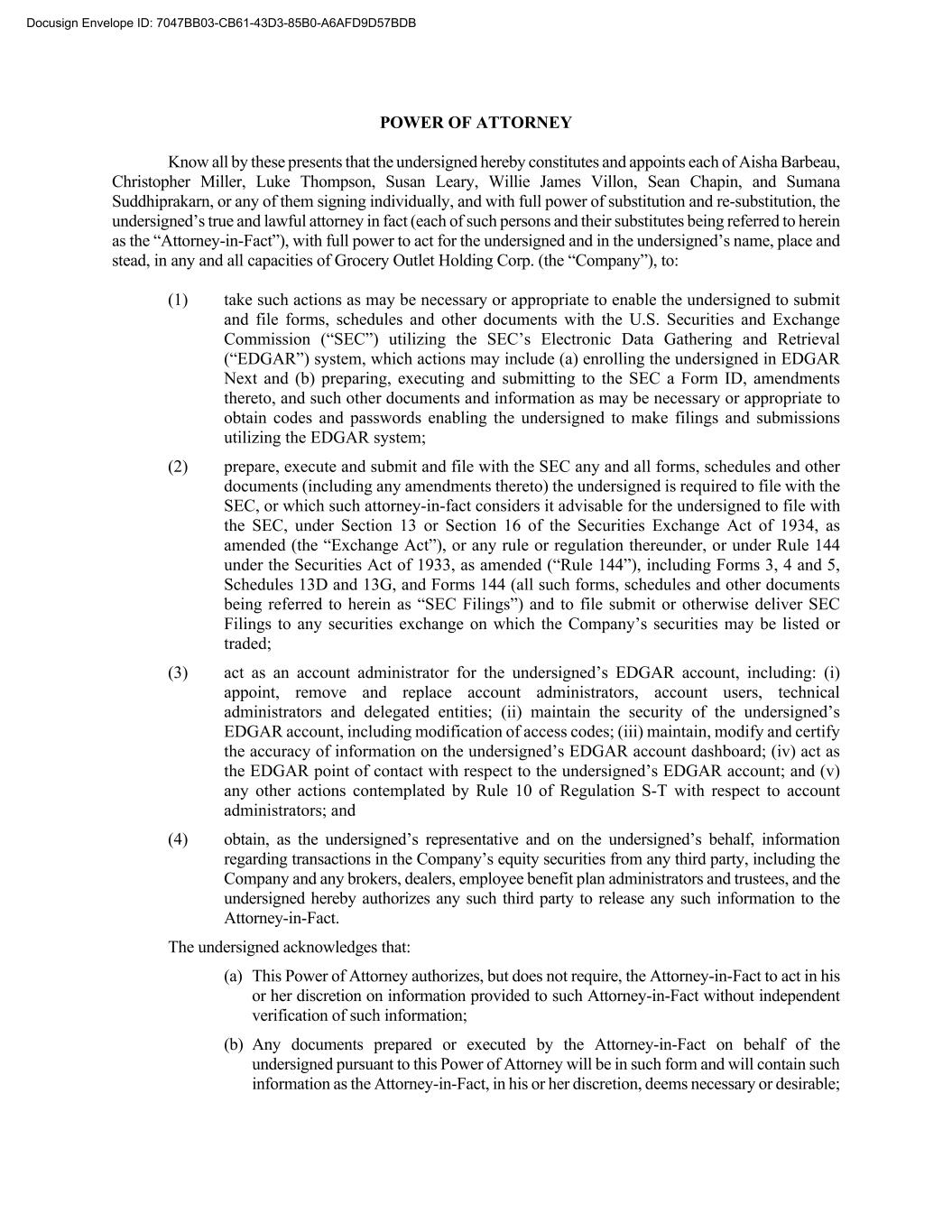 POWER OF ATTORNEY Know all by these presents that the undersigned hereby constitutes and appoints each of Aisha Barbeau, Christopher Miller, Luke Thompson, Susan Leary, Willie James Villon, Sean Chapin, and Sumana Suddhiprakarn, or any of them signing individually, and with full power of substitution and re-substitution, the undersigned’s true and lawful attorney in fact (each of such persons and their substitutes being referred to herein as the “Attorney-in-Fact”), with full power to act for the undersigned and in the undersigned’s name, place and stead, in any and all capacities of Grocery Outlet Holding Corp. (the “Company”), to: (1) take such actions as may be necessary or appropriate to enable the undersigned to submit and file forms, schedules and other documents with the U.S. Securities and Exchange Commission (“SEC”) utilizing the SEC’s Electronic Data Gathering and Retrieval (“EDGAR”) system, which actions may include (a) enrolling the undersigned in EDGAR Next and (b) preparing, executing and submitting to the SEC a Form ID, amendments thereto, and such other documents and information as may be necessary or appropriate to obtain codes and passwords enabling the undersigned to make filings and submissions utilizing the EDGAR system; (2) prepare, execute and submit and file with the SEC any and all forms, schedules and other documents (including any amendments thereto) the undersigned is required to file with the SEC, or which such attorney-in-fact considers it advisable for the undersigned to file with the SEC, under Section 13 or Section 16 of the Securities Exchange Act of 1934, as amended (the “Exchange Act”), or any rule or regulation thereunder, or under Rule 144 under the Securities Act of 1933, as amended (“Rule 144”), including Forms 3, 4 and 5, Schedules 13D and 13G, and Forms 144 (all such forms, schedules and other documents being referred to herein as “SEC Filings”) and to file submit or otherwise deliver SEC Filings to any securities exchange on which the Company’s securities may be listed or traded; (3) act as an account administrator for the undersigned’s EDGAR account, including: (i) appoint, remove and replace account administrators, account users, technical administrators and delegated entities; (ii) maintain the security of the undersigned’s EDGAR account, including modification of access codes; (iii) maintain, modify and certify the accuracy of information on the undersigned’s EDGAR account dashboard; (iv) act as the EDGAR point of contact with respect to the undersigned’s EDGAR account; and (v) any other actions contemplated by Rule 10 of Regulation S-T with respect to account administrators; and (4) obtain, as the undersigned’s representative and on the undersigned’s behalf, information regarding transactions in the Company’s equity securities from any third party, including the Company and any brokers, dealers, employee benefit plan administrators and trustees, and the undersigned hereby authorizes any such third party to release any such information to the Attorney-in-Fact. The undersigned acknowledges that: (a) This Power of Attorney authorizes, but does not require, the Attorney-in-Fact to act in his or her discretion on information provided to such Attorney-in-Fact without independent verification of such information; (b) Any documents prepared or executed by the Attorney-in-Fact on behalf of the undersigned pursuant to this Power of Attorney will be in such form and will contain such information as the Attorney-in-Fact, in his or her discretion, deems necessary or desirable; Docusign Envelope ID: 7047BB03-CB61-43D3-85B0-A6AFD9D57BDB
