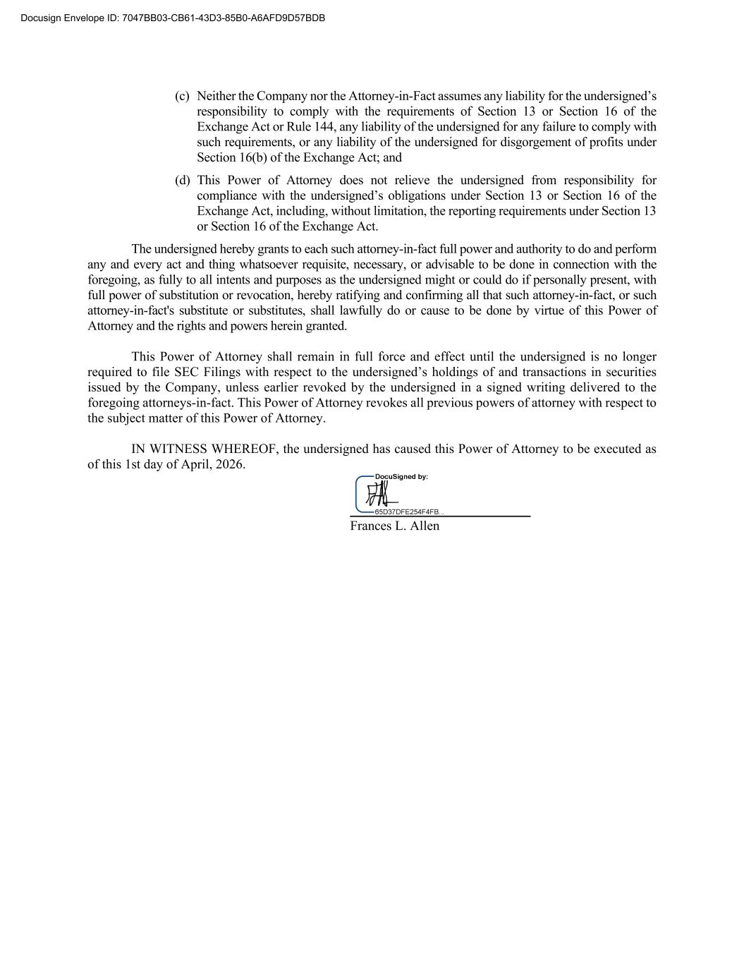 (c) Neither the Company nor the Attorney-in-Fact assumes any liability for the undersigned’s responsibility to comply with the requirements of Section 13 or Section 16 of the Exchange Act or Rule 144, any liability of the undersigned for any failure to comply with such requirements, or any liability of the undersigned for disgorgement of profits under Section 16(b) of the Exchange Act; and (d) This Power of Attorney does not relieve the undersigned from responsibility for compliance with the undersigned’s obligations under Section 13 or Section 16 of the Exchange Act, including, without limitation, the reporting requirements under Section 13 or Section 16 of the Exchange Act. The undersigned hereby grants to each such attorney-in-fact full power and authority to do and perform any and every act and thing whatsoever requisite, necessary, or advisable to be done in connection with the foregoing, as fully to all intents and purposes as the undersigned might or could do if personally present, with full power of substitution or revocation, hereby ratifying and confirming all that such attorney-in-fact, or such attorney-in-fact's substitute or substitutes, shall lawfully do or cause to be done by virtue of this Power of Attorney and the rights and powers herein granted. This Power of Attorney shall remain in full force and effect until the undersigned is no longer required to file SEC Filings with respect to the undersigned’s holdings of and transactions in securities issued by the Company, unless earlier revoked by the undersigned in a signed writing delivered to the foregoing attorneys-in-fact. This Power of Attorney revokes all previous powers of attorney with respect to the subject matter of this Power of Attorney. IN WITNESS WHEREOF, the undersigned has caused this Power of Attorney to be executed as of this 1st day of April, 2026. ___________________________ Frances L. Allen Docusign Envelope ID: 7047BB03-CB61-43D3-85B0-A6AFD9D57BDB