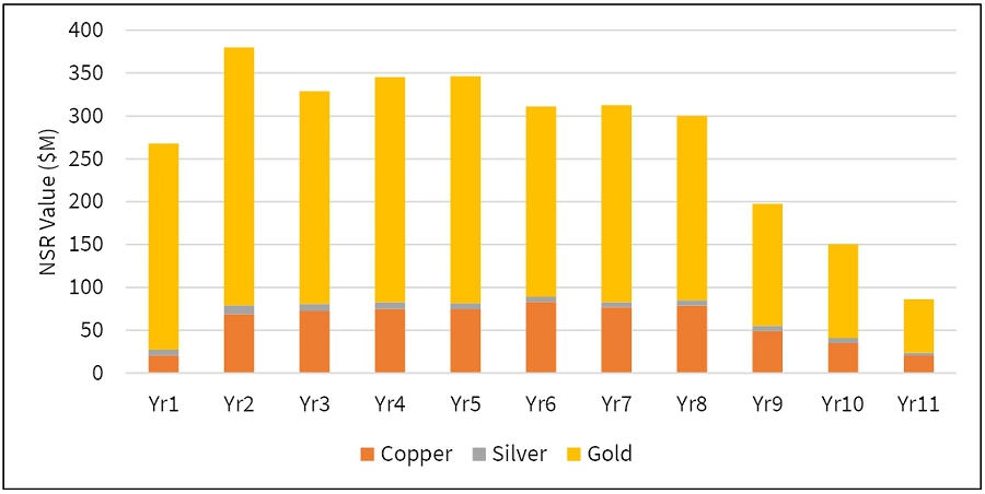 The FS confirms robust economics for a low-cost, large-scale, conventional open pit feeding a simple copper-gold concentrator process plant, with competitive operating costs and high rate of return. The FS outlines total production of: 931 koz AuEq over an 11-year operating mine life (followed by two years of closure), resulting in an average LOM annual production profile of 85 koz AuEq per annum at an AISC of $1785/oz AuEq. The Project generates an after-tax NPV5% of $632 M with an after-tax IRR of 27% at base case gold, copper and silver prices of $3,250/oz, $4.50/lb and $40/oz, respectively.