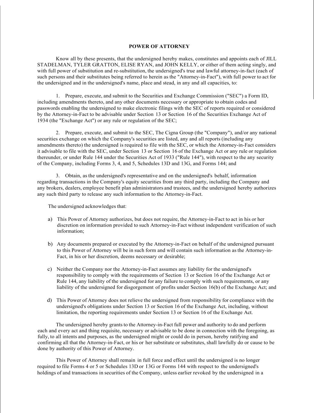 POWER OF ATTORNEY Know all by these presents, that the undersigned hereby makes, constitutes and appoints each of JILL STADELMAN, TYLER GRATTON, ELISE RYAN, and JOHN KELLY, or either of them acting singly, and with full power of substitution and re-substitution, the undersigned's true and lawful attorney-in-fact (each of such persons and their substitutes being referred to herein as the "Attorney-in-Fact"), with full power to act for the undersigned and in the undersigned's name, place and stead, in any and all capacities, to: 1. Prepare, execute, and submit to the Securities and Exchange Commission ("SEC") a Form ID, including amendments thereto, and any other documents necessary or appropriate to obtain codes and passwords enabling the undersigned to make electronic filings with the SEC of reports required or considered by the Attorney-in-Fact to be advisable under Section 13 or Section 16 of the Securities Exchange Act of 1934 (the "Exchange Act") or any rule or regulation of the SEC; 2. Prepare, execute, and submit to the SEC, The Cigna Group (the "Company"), and/or any national securities exchange on which the Company's securities are listed, any and all reports (including any amendments thereto) the undersigned is required to file with the SEC, or which the Attorney-in-Fact considers it advisable to file with the SEC, under Section 13 or Section 16 of the Exchange Act or any rule or regulation thereunder, or under Rule 144 under the Securities Act of 1933 ("Rule 144"), with respect to the any security of the Company, including Forms 3, 4, and 5, Schedules 13D and 13G, and Forms 144; and 3. Obtain, as the undersigned's representative and on the undersigned's behalf, information regarding transactions in the Company's equity securities from any third party, including the Company and any brokers, dealers, employee benefit plan administrators and trustees, and the undersigned hereby authorizes any such third party to release any such information to the Attorney-in-Fact. The undersigned acknowledges that: a) This Power of Attorney authorizes, but does not require, the Attorney-in-Fact to act in his or her discretion on information provided to such Attorney-in-Fact without independent verification of such information; b) Any documents prepared or executed by the Attorney-in-Fact on behalf of the undersigned pursuant to this Power of Attorney will be in such form and will contain such information as the Attorney-in- Fact, in his or her discretion, deems necessary or desirable; c) Neither the Company nor the Attorney-in-Fact assumes any liability for the undersigned's responsibility to comply with the requirements of Section 13 or Section 16 of the Exchange Act or Rule 144, any liability of the undersigned for any failure to comply with such requirements, or any liability of the undersigned for disgorgement of profits under Section l 6(b) of the Exchange Act; and d) This Power of Attorney does not relieve the undersigned from responsibility for compliance with the undersigned's obligations under Section 13 or Section 16 of the Exchange Act, including, without limitation, the reporting requirements under Section 13 or Section 16 of the Exchange Act. The undersigned hereby grants to the Attorney-in-Fact full power and authority to do and perform each and every act and thing requisite, necessary or advisable to be done in connection with the foregoing, as fully, to all intents and purposes, as the undersigned might or could do in person, hereby ratifying and confirming all that the Attorney-in-Fact, or his or her substitute or substitutes, shall lawfully do or cause to be done by authority of this Power of Attorney. This Power of Attorney shall remain in full force and effect until the undersigned is no longer required to file Forms 4 or 5 or Schedules 13D or I 3G or Forms 144 with respect to the undersigned's holdings of and transactions in securities of the Company, unless earlier revoked by the undersigned in a