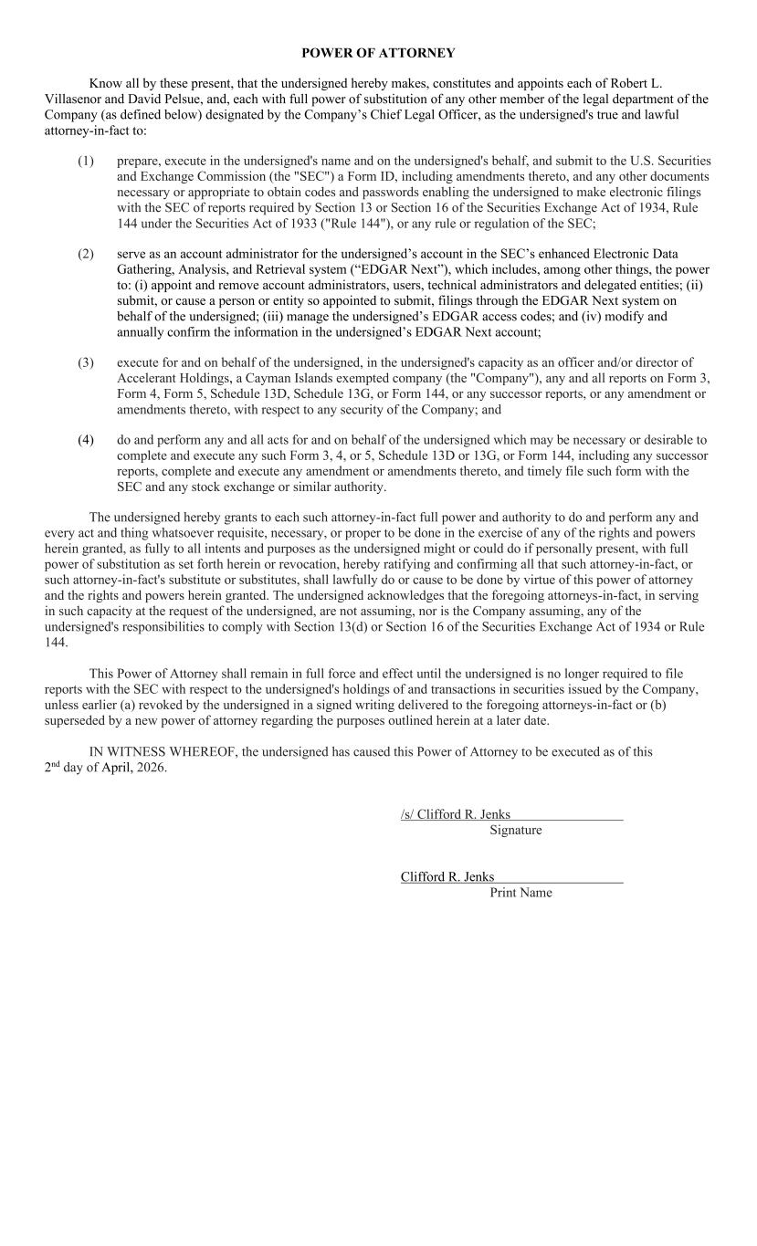 POWER OF ATTORNEY Know all by these present, that the undersigned hereby makes, constitutes and appoints each of Robert L. Villasenor and David Pelsue, and, each with full power of substitution of any other member of the legal department of the Company (as defined below) designated by the Company’s Chief Legal Officer, as the undersigned's true and lawful attorney-in-fact to: (1) prepare, execute in the undersigned's name and on the undersigned's behalf, and submit to the U.S. Securities and Exchange Commission (the "SEC") a Form ID, including amendments thereto, and any other documents necessary or appropriate to obtain codes and passwords enabling the undersigned to make electronic filings with the SEC of reports required by Section 13 or Section 16 of the Securities Exchange Act of 1934, Rule 144 under the Securities Act of 1933 ("Rule 144"), or any rule or regulation of the SEC; (2) serve as an account administrator for the undersigned’s account in the SEC’s enhanced Electronic Data Gathering, Analysis, and Retrieval system (“EDGAR Next”), which includes, among other things, the power to: (i) appoint and remove account administrators, users, technical administrators and delegated entities; (ii) submit, or cause a person or entity so appointed to submit, filings through the EDGAR Next system on behalf of the undersigned; (iii) manage the undersigned’s EDGAR access codes; and (iv) modify and annually confirm the information in the undersigned’s EDGAR Next account; (3) execute for and on behalf of the undersigned, in the undersigned's capacity as an officer and/or director of Accelerant Holdings, a Cayman Islands exempted company (the "Company"), any and all reports on Form 3, Form 4, Form 5, Schedule 13D, Schedule 13G, or Form 144, or any successor reports, or any amendment or amendments thereto, with respect to any security of the Company; and (4) do and perform any and all acts for and on behalf of the undersigned which may be necessary or desirable to complete and execute any such Form 3, 4, or 5, Schedule 13D or 13G, or Form 144, including any successor reports, complete and execute any amendment or amendments thereto, and timely file such form with the SEC and any stock exchange or similar authority. The undersigned hereby grants to each such attorney-in-fact full power and authority to do and perform any and every act and thing whatsoever requisite, necessary, or proper to be done in the exercise of any of the rights and powers herein granted, as fully to all intents and purposes as the undersigned might or could do if personally present, with full power of substitution as set forth herein or revocation, hereby ratifying and confirming all that such attorney-in-fact, or such attorney-in-fact's substitute or substitutes, shall lawfully do or cause to be done by virtue of this power of attorney and the rights and powers herein granted. The undersigned acknowledges that the foregoing attorneys-in-fact, in serving in such capacity at the request of the undersigned, are not assuming, nor is the Company assuming, any of the undersigned's responsibilities to comply with Section 13(d) or Section 16 of the Securities Exchange Act of 1934 or Rule 144. This Power of Attorney shall remain in full force and effect until the undersigned is no longer required to file reports with the SEC with respect to the undersigned's holdings of and transactions in securities issued by the Company, unless earlier (a) revoked by the undersigned in a signed writing delivered to the foregoing attorneys-in-fact or (b) superseded by a new power of attorney regarding the purposes outlined herein at a later date. IN WITNESS WHEREOF, the undersigned has caused this Power of Attorney to be executed as of this 2nd day of April, 2026. /s/ Clifford R. Jenks Signature Clifford R. Jenks Print Name