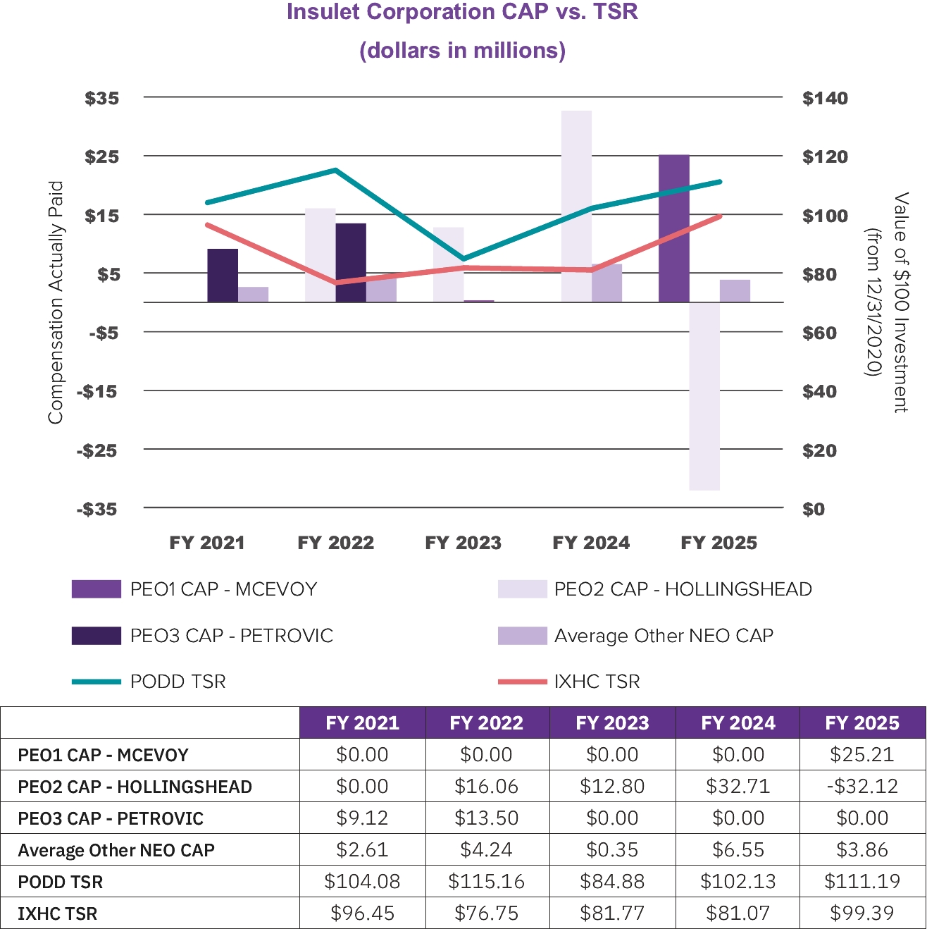 The following graph compares the compensation actually paid to our PEOs and the average of compensation actually paid to our Other NEOs with Insulet’s cumulative total shareholder return (“PODD TSR”) and the cumulative total shareholder return of the Nasdaq Healthcare Index (“IXHC TSR”). The PODD TSR and the IXHC TSR assume that $100 was invested beginning on December 31, 2020. The PODD TSR declined from December 31, 2022 to December 31, 2023, recovered from December 31, 2023 to December 31, 2024 and continued to increase from December 31, 2024 to December 31, 2025. PEO and Average Other NEO compensation generally follows a similar pattern for that period: declining from December 31, 2022 to December 31, 2023 and increasing from December 31, 2023 to December 31, 2024. PEO and Average Other NEO CAP decreased overall in 2025 in part due to the termination of Mr. Hollingshead as our PEO and the hiring of Ms. McEvoy as our PEO in April 2025. Due to these events, the CAP to Mr. Hollingshead reflects forfeiture of unearned equity awards and the CAP for Ms. McEvoy reflects compensation for a partial year, from April 28, 2025 to December 31, 2025. We anticipate that PEO CAP will increase in 2026, reflecting a full year of compensation for Ms. McEvoy. Additionally, the PODD TSR since December 31, 2020 is positive and higher than the IXHC TSR for the same period.
