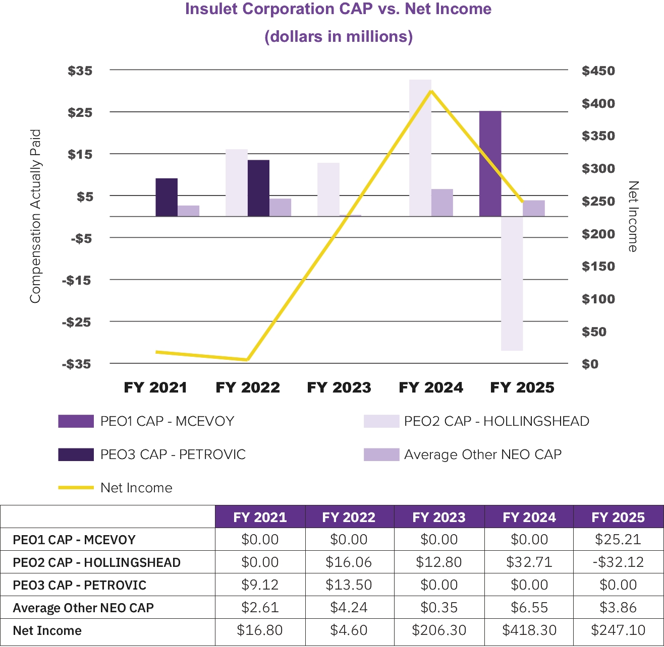 The following graph compares the compensation actually paid to each of our PEOs and the average of compensation actually paid to our Other NEOs with our net income. The Company’s net income increased considerably from 2023 to 2024 and then decreased from 2024 to 2025. In addition, PEO and average NEO compensation actually paid increased between 2023 and 2024 then decreased between 2024 and 2025. Net income is not a financial measure used by our Talent and Compensation Committee to link the compensation actually paid to our NEOs to Company performance.