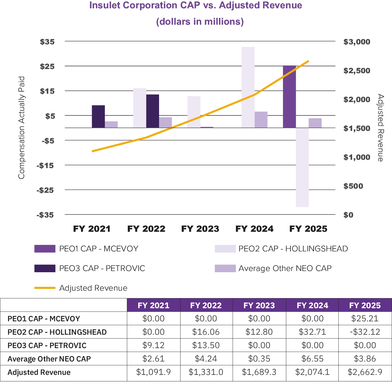 The following graph compares the compensation actually paid to our PEO and the average compensation actually paid to our Other NEOs with our adjusted revenue. The Company’s adjusted revenue increased considerably from 2023 to 2024 and from 2024 to 2025. CAP also increased from 2023 to 2024 and decreased from 2024 to 2025. The decrease in CAP in 2025 was in part due to the termination of Mr. Hollingshead as our PEO and the hiring of Ms. McEvoy as our PEO in April 2025, as further detailed in the lead-in to the Insulet Corporation CAP vs. TSR Graph on page 53. As noted above and in the 2025 Compensation Elements and Decisions section of the CD&A, Adjusted Revenue is one of the most important financial measures used to link compensation actually paid to our NEOs to company performance and is the most heavily weighted measure in the Annual Incentive Plan and for our PSUs.