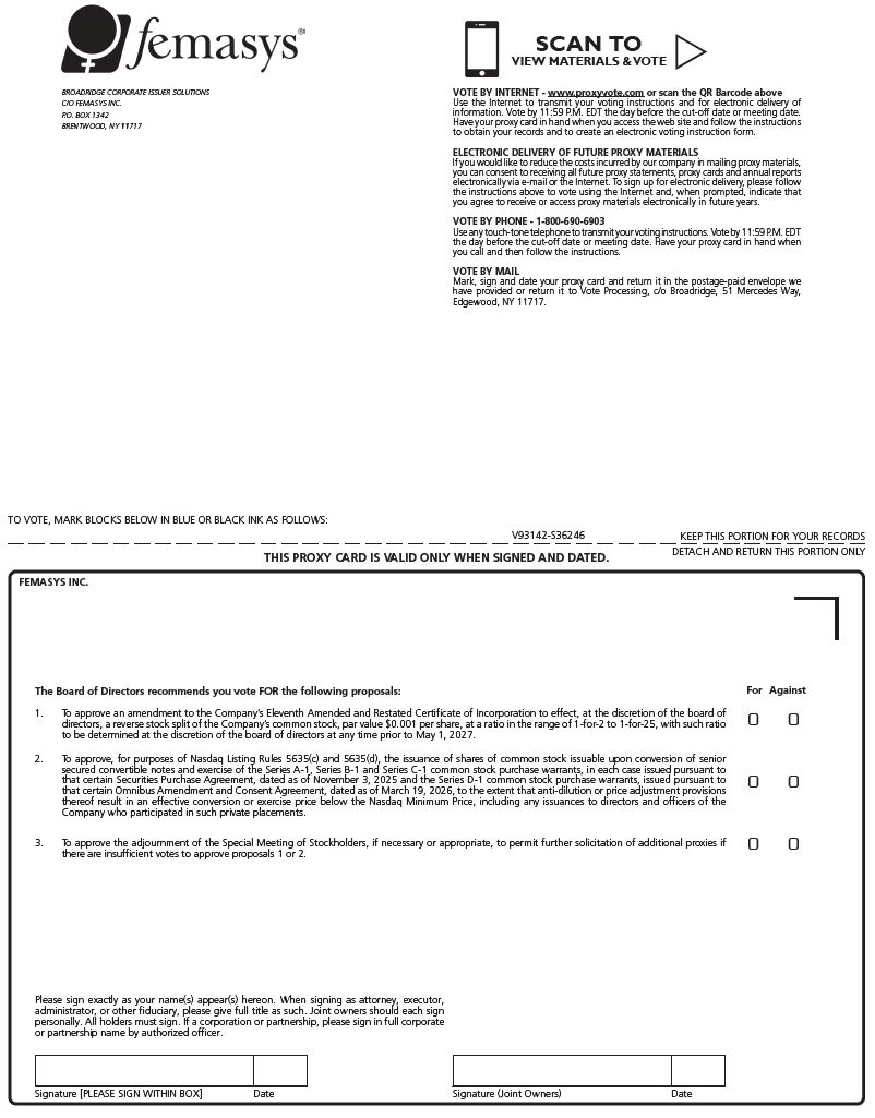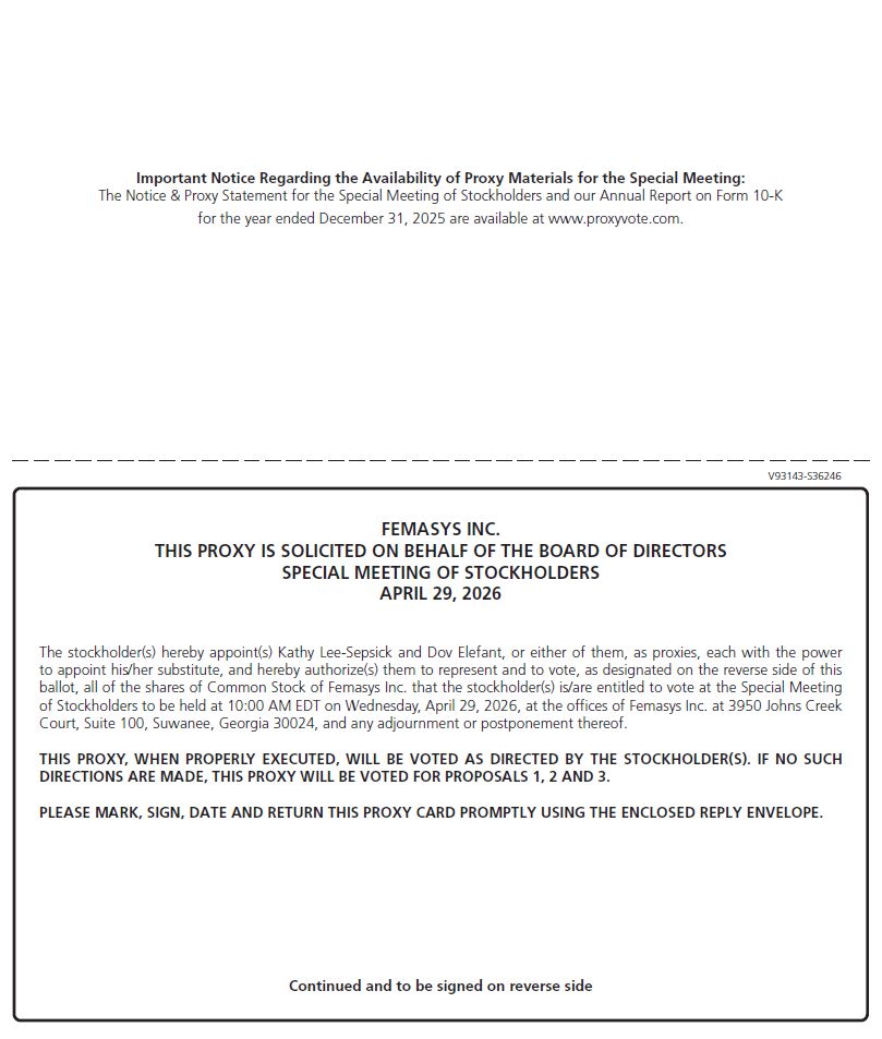 the Special Meeting: The Notice & Proxy Statement for the Special Meeting of Stockholders and our Annual Report on Form 10-K for the year ended December 31, 2025 are available at www.proxyvote.com. FEMASYS INC. THIS PROXY IS SOLICITED