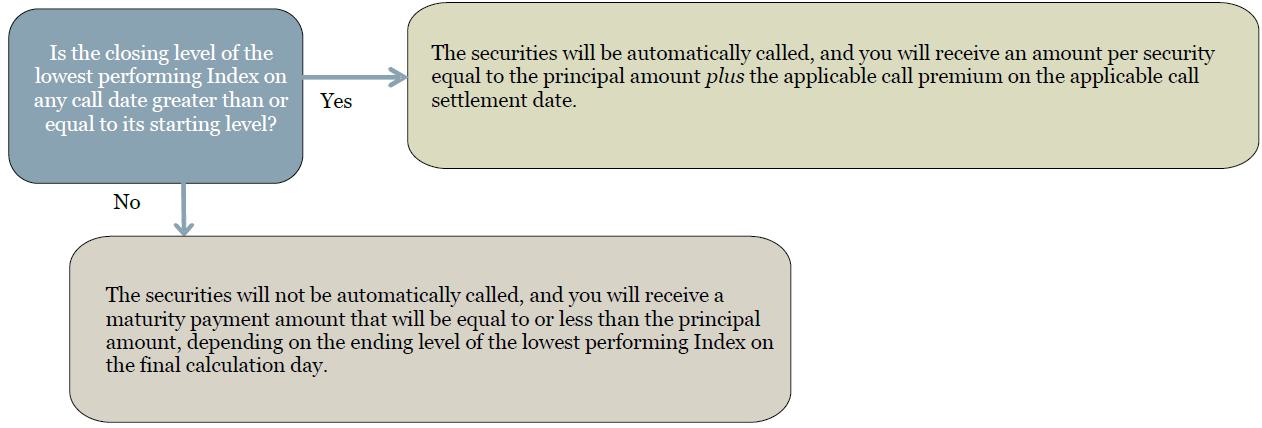 | § | You are willing and able to accept the risk that, if the securities are not automatically called and the ending level of the lowest performing Index on the final calculation day is less than its threshold level, you will lose more than 50%, and possibly all, of the principal amount of your securities at maturity. |
