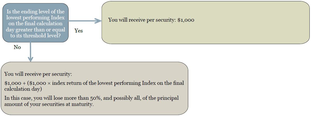 If the securities are not automatically called, then on the stated maturity date, you will be entitled to receive a cash payment per security in U.S. dollars equal to the maturity payment amount. The “maturity payment amount” per security will equal: · if the ending level of the lowest performing Index on the final calculation day is greater than or equal to its threshold level: $1,000; or · if the ending level of the lowest performing Index on the final calculation day is less than its threshold level: $1,000 + ($1,000 × index return of the lowest performing Index on the final calculation day) If the securities are not automatically called and the ending level of the lowest performing Index on the final calculation day is less than its threshold level, you will have full downside exposure to the decrease in the level of that Index from its starting level, and you will lose more than 50%, and possibly all, of the principal amount of your securities at maturity. |