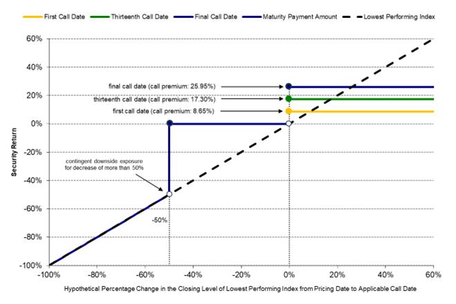This example illustrates that you will be fully exposed to a decrease in the level of the lowest performing Index on the final calculation day if the securities are not automatically called and the ending level of the lowest performing Index on the final calculation day is less than its threshold level, even if the ending levels of the other Indices have appreciated or have not declined below their respective threshold levels.