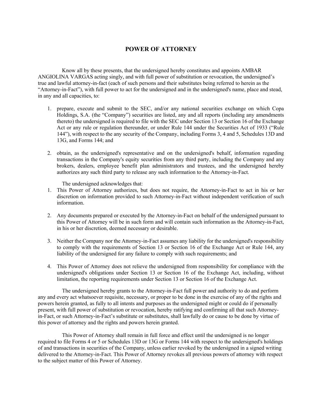POWER OF ATTORNEY Know all by these presents, that the undersigned hereby constitutes and appoints AMBAR ANGIOLINA VARGAS acting singly, and with full power of substitution or revocation, the undersigned’s true and lawful attorney-in-fact (each of such persons and their substitutes being referred to herein as the “Attorney-in-Fact”), with full power to act for the undersigned and in the undersigned's name, place and stead, in any and all capacities, to: 1. prepare, execute and submit to the SEC, and/or any national securities exchange on which Copa Holdings, S.A. (the “Company”) securities are listed, any and all reports (including any amendments thereto) the undersigned is required to file with the SEC under Section 13 or Section 16 of the Exchange Act or any rule or regulation thereunder, or under Rule 144 under the Securities Act of 1933 (“Rule 144”), with respect to the any security of the Company, including Forms 3, 4 and 5, Schedules 13D and 13G, and Forms 144; and 2. obtain, as the undersigned's representative and on the undersigned's behalf, information regarding transactions in the Company's equity securities from any third party, including the Company and any brokers, dealers, employee benefit plan administrators and trustees, and the undersigned hereby authorizes any such third party to release any such information to the Attorney-in-Fact. The undersigned acknowledges that: 1. This Power of Attorney authorizes, but does not require, the Attorney-in-Fact to act in his or her discretion on information provided to such Attorney-in-Fact without independent verification of such information. 2. Any documents prepared or executed by the Attorney-in-Fact on behalf of the undersigned pursuant to this Power of Attorney will be in such form and will contain such information as the Attorney-in-Fact, in his or her discretion, deemed necessary or desirable. 3. Neither the Company nor the Attorney-in-Fact assumes any liability for the undersigned's responsibility to comply with the requirements of Section 13 or Section 16 of the Exchange Act or Rule 144, any liability of the undersigned for any failure to comply with such requirements; and 4. This Power of Attorney does not relieve the undersigned from responsibility for compliance with the undersigned's obligations under Section 13 or Section 16 of the Exchange Act, including, without limitation, the reporting requirements under Section 13 or Section 16 of the Exchange Act. The undersigned hereby grants to the Attorney-in-Fact full power and authority to do and perform any and every act whatsoever requisite, necessary, or proper to be done in the exercise of any of the rights and powers herein granted, as fully to all intents and purposes as the undersigned might or could do if personally present, with full power of substitution or revocation, hereby ratifying and confirming all that such Attorney- in-Fact, or such Attorney-in-Fact’s substitute or substitutes, shall lawfully do or cause to be done by virtue of this power of attorney and the rights and powers herein granted. This Power of Attorney shall remain in full force and effect until the undersigned is no longer required to file Forms 4 or 5 or Schedules 13D or 13G or Forms 144 with respect to the undersigned's holdings of and transactions in securities of the Company, unless earlier revoked by the undersigned in a signed writing delivered to the Attorney-in-Fact. This Power of Attorney revokes all previous powers of attorney with respect to the subject matter of this Power of Attorney.