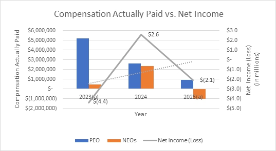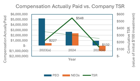 | Year | | Reported Summary Compensation Table Total for PEO | | | Reported Value of Equity Awards (4) | | | Equity Award Adjustments (5) | | | Reported Change in the Actuarial Present Value of Pension Benefits | | | Pension Benefit Adjustments | | | Compensation Actually Paid to PEO | | | | | | | | | | | | | | | | | | | | | | | 2025 | | $ | 377,416 | | | $ | - | | | $ | (168,512 | ) | | $ | - | | | $ | - | | | $ | 208,904 | | | 2024 | | $ | - | | | $ | - | | | $ | - | | | $ | - | | | $ | - | | | $ | - | | | 2023 | | $ | - | | | $ | - | | | $ | - | | | $ | - | | | $ | - | | | $ | - | |
