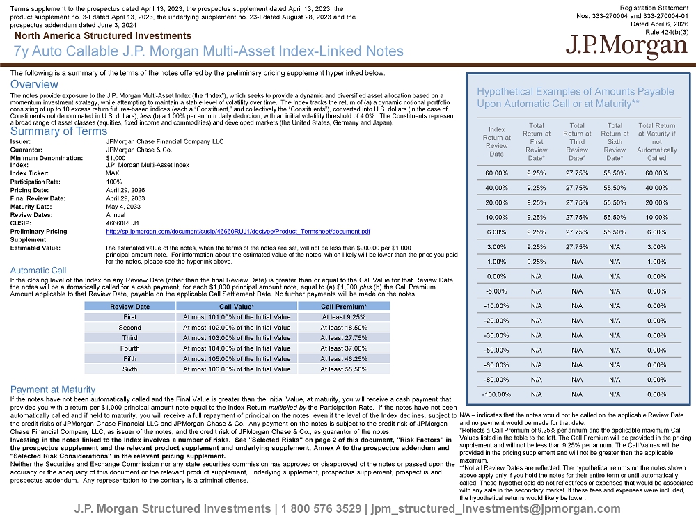 The following is a summary of the terms of the notes offered by the preliminary pricing supplement hyperlinked below. Overview The notes provide exposure to the J.P. Morgan Multi - Asset Index (the “Index”), which seeks to provide a dynamic and diversified asset allocation based on a momentum investment strategy, while attempting to maintain a stable level of volatility over time. The Index tracks the retu rn of (a) a dynamic notional portfolio consisting of up to 10 excess return futures - based indices (each a “Constituent,” and collectively the “Constituents”), converte d into U.S. dollars (in the case of Constituents not denominated in U.S. dollars), less (b) a 1.00% per annum daily deduction, with an initial volatility threshold of 4.0%. The Constituents represent a broad range of asset classes (equities, fixed income and commodities) and developed markets (the United States, Germany and Ja pan). Summary of Terms Issuer: JPMorgan Chase Financial Company LLC Guarantor: JPMorgan Chase & Co. Minimum Denomination: $1,000 Index: J.P. Morgan Multi - Asset Index Index Ticker: MAX Participation Rate: 100% Pricing Date: April 29, 2026 Final Review Date: April 29, 2033 Maturity Date: May 4, 2033 Review Dates: Annual CUSIP: 46660RUJ1 Preliminary Pricing http://sp.jpmorgan.com/document/cusip/46660RUJ1/doctype/Product_Termsheet/document .pdf Supplement: Estimated Value: The estimated value of the notes, when the terms of the notes are set, will not be less than $900.00 p er $1,000 principal amount note. For information about the estimated value of the notes, which likely will be lower than the price you pa id for the notes, please see the hyperlink above. Automatic Call If the closing level of the Index on any Review Date (other than the final Review Date) is greater than or equal to the Call Val ue for that Review Date, the notes will be automatically called for a cash payment, for each $1,000 principal amount note, equal to (a) $1,000 plus (b) the Call Premium Amount applicable to that Review Date, payable on the applicable Call Settlement Date. No further payments will be made on th e n otes. Payment at Maturity If the notes have not been automatically called and the Final Value is greater than the Initial Value, at maturity, you will rec eive a cash payment that provides you with a return per $1,000 principal amount note equal to the Index Return multiplied by the Participation Rate. If the notes have not been automatically called and if held to maturity, you will receive a full repayment of principal on the notes, even if the level of the Index declines, subject to the credit risks of JPMorgan Chase Financial LLC and JPMorgan Chase & Co . Any payment on the notes is subject to the credit risk of JPMorgan Chase Financial Company LLC, as issuer of the notes, and the credit risk of JPMorgan Chase & Co., as guarantor of the notes. Investing in the notes linked to the Index involves a number of risks. See "Selected Risks" on page 2 of this document, "Ris k F actors" in the prospectus supplement and the relevant product supplement and underlying supplement, Annex A to the prospectus addendum a nd "Selected Risk Considerations" in the relevant pricing supplement. Neither the Securities and Exchange Commission nor any state securities commission has approved or disapproved of the notes o r p assed upon the accuracy or the adequacy of this document or the relevant product supplement, underlying supplement, prospectus supplement, p ros pectus and prospectus addendum. Any representation to the contrary is a criminal offense. J.P. Morgan Structured Investments | 1 800 576 3529 | jpm_structured_investments@jpmorgan.com 7y Auto Callable J.P. Morgan Multi - Asset Index - Linked Notes North America Structured Investments Terms supplement to the prospectus dated April 13, 2023, the prospectus supplement dated April 13, 2023, the product supplement no. 3 - I dated April 13, 2023, the underlying supplement no. 23 - I dated August 28, 2023 and the prospectus addendum dated June 3, 2024 Registration Statement Nos. 333 - 270004 and 333 - 270004 - 01 Dated April 6, 2026 Rule 424(b)(3) Total Return at Maturity if not Automatically Called Total Return at Sixth Review Date* Total Return at Third Review Date* Total Return at First Review Date* Index Return at Review Date 60.00% 55.50% 27.75% 9.25 % 60.00% 40.00% 55.50% 27.75% 9.25 % 40.00% 20.00% 55.50% 27.75% 9.25 % 20.00% 10.00% 55.50% 27.75% 9.25 % 10.00% 6.00% 55.50% 27.75% 9.25 % 6.00% 3.00% N/A 27.75% 9.25 % 3.00% 1.00% N/A N/A 9.25 % 1.00% 0.00% N/A N/A N/A 0.00% 0.00% N/A N/A N/A - 5.00% 0.00% N/A N/A N/A - 10.00% 0.00% N/A N/A N/A - 20.00% 0.00% N/A N/A N/A - 30.00% 0.00% N/A N/A N/A - 50.00% 0.00% N/A N/A N/A - 60.00% 0.00% N/A N/A N/A - 80.00% 0.00% N/A N/A N/A - 100.00% Hypothetical Examples of Amounts Payable Upon Automatic Call or at Maturity** N/A – indicates that the notes would not be called on the applicable Review Date and no payment would be made for that date. *Reflects a Call Premium of 9.25% per annum and the applicable maximum Call Values listed in the table to the left. The Call Premium will be provided in the pricing supplement and will not be less than 9.25% per annum. The Call Values will be provided in the pricing supplement and will not be greater than the applicable maximum. **Not all Review Dates are reflected. The hypothetical returns on the notes shown above apply only if you hold the notes for their entire term or until automatically called. These hypotheticals do not reflect fees or expenses that would be associated with any sale in the secondary market. If these fees and expenses were included, the hypothetical returns would likely be lower. Call Premium* Call Value* Review Date At least 9.25% At most 101.00% of the Initial Value First At least 18.50% At most 102.00% of the Initial Value Second At least 27.75% At most 103.00% of the Initial Value Third At least 37.00 % At most 104.00% of the Initial Value Fourth At l