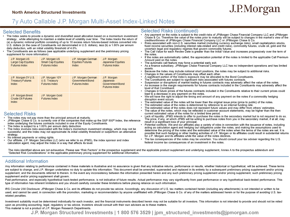 J.P. Morgan Structured Investments | 1 800 576 3529 | jpm_structured_investments@jpmorgan.com Selected Risks • The notes may not pay more than the principal amount at maturity. • JPMorgan Chase & Co. is currently one of the companies that make up the S&P 500 ® Index, the reference index underlying the futures contracts included in one of the Equity Constituents. • The Index is subject to a 1.00% per annum daily deduction. • The Index involves risks associated with the Index’s momentum investment strategy, which may not be successful, and the Index may not approximate its initial volatility threshold or outperform an alternative strategy. • No interest payments or voting rights. • Our affiliate, J.P. Morgan Securities LLC (who we refer to as JPMS), the index sponsor and index calculation agent, may adjust the Index in a way that affects its level. Selected Risks (continued) • Any payment on the notes is subject to the credit risks of JPMorgan Chase Financial Company LLC and JPMorgan Chase & Co. Therefore the value of the notes prior to maturity will be subject to changes in the market’s view of the creditworthiness of JPMorgan Chase Financial Company LLC or JPMorgan Chase & Co. • Risks associated with non - U.S. securities market (including currency exchange risks), small capitalization stocks, fixed income securities (including interest rate - related and credit risks), commodity futures, crude oil, gold and the uncertain legal and regulatory regimes that govern commodity futures. • The Call Value for each Review Date is greater than the Initial Value and increases progressively over the term of the notes. • If the notes are automatically called, the appreciation potential of the notes is limited to the applicable Call Premium Amount paid on the notes. • The automatic call feature may force a potential early exit. • As a finance subsidiary, JPMorgan Chase Financial Company LLC has no independent operations and has limited assets. • Because the Index may include notional short positions, the notes may be subject to additional risks. • Changes in the values of Constituents may offset each other. • A significant portion of the Index’s exposure may be allocated to the Bond Constituents. • The Constituents are subject to significant risks associated with futures contracts. • Suspension or disruptions of market trading in futures contracts may adversely affect the value of the notes. • An increase in the margin requirements for futures contracts included in the Constituents may adversely affect the level of that Constituent. • Changes in future prices of the futures contracts included in the Constituents relative to their current prices could lead to a decrease in any payment on the notes. • We will have the right to adjust the timing and amount of any payment on the notes if a commodity hedging disruption event occurs. • The estimated value of the notes will be lower than the original issue price (price to public) of the notes. • The estimated value of the notes is determined by reference to an internal funding rate. • The estimated value of the notes does not represent future values and may differ from others’ estimates. • The value of the notes, which may be reflected in customer account statements, may be higher than the then current estimated value of the notes for a limited time period. • Lack of liquidity: JPMS intends to offer to purchase the notes in the secondary market but is not required to do so. The price, if any, at which JPMS will be willing to purchase notes from you in the secondary market, if at all, may result in a significant loss of your principal. • Potential conflicts: We and our affiliates play a variety of roles in connection with the issuance of notes, including acting as calculation agent and hedging our obligations under the notes, and making the assumptions used to determine the pricing of the notes and the estimated value of the notes when the terms of the notes are set. It is possible that such hedging or other trading activities of J.P. Morgan or its affiliates could result in substantial returns for J.P. Morgan and its affiliates while the value of the notes declines. • The tax consequences of the notes may be uncertain. You should consult your tax adviser regarding the U.S. federal income tax consequences of an investment in the notes. Additional Information Any information relating to performance contained in these materials is illustrative and no assurance is given that any indic ati ve returns, performance or results, whether historical or hypothetical, will be achieved. These terms are subject to change, and J.P. Morgan undertakes no duty to update this information. This document shall be amended, superse ded and replaced in its entirety by a subsequent preliminary pricing supplement and/or pricing supplement, and the documents referred to therein. In the event any inconsistency between the information presented herein an d a ny such preliminary pricing supplement and/or pricing supplement, such preliminary pricing supplement and/or pricing supplement shall govern. Past performance, and especially hypothetical back - tested performance, is not indicative of future results. Actual performance m ay vary significantly from past performance or any hypothetical back - tested performance. This type of information has inherent limitations and you should carefully consider these limitations before placing reliance on s uch information. IRS Circular 230 Disclosure: JPMorgan Chase & Co. and its affiliates do not provide tax advice. Accordingly, any discussion o f U .S. tax matters contained herein (including any attachments) is not intended or written to be used, and cannot be used, in connection with the promotion, marketing or recommendation by anyone unaffiliated with JPMorgan Cha se & Co. of any of the matters addressed herein or for the purpose of avoiding U.S. tax - related penalties. Investment s
