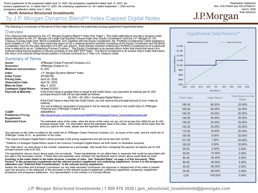 H The following is a summary of the terms of the notes offered by the preliminary pricing supplement hyperlinked below. Overview The notes provide exposure to the J.P. Morgan Dynamic Blend ℠ Index (the “Index”). The Index attempts to provide a dynamic rules - based allocation to the J.P. Morgan US Large Cap Equities Futures Index (the “Equity Constituent”) and the J.P. Morgan 2Y US Treasury Futures Index (the “Bond Constituent” and, together with the Equity Constituent, the “Portfolio Constituents”) while ta rgeting a level volatility of 3.0%. The Index tracks the return of (a) a notional dynamic portfolio consisting of the Equity Constitue nt and the Bond Constituent, less (b) the daily deduction of 0.95% per annum. Each futures contract underlying a Portfolio Constituent as of a particular time is referred to as an “Underlying Futures Contract.” The Equity Constituent is an excess return index that tracks the re tur n of a notional rolling futures position in futures contracts on the S&P 500 ® Index. The Bond Constituent is an excess return index that tracks the return of a notional rolling futures position in futures contracts on 2 - Year U.S. treasury notes. Summary of Terms Issuer: JPMorgan Chase Financial Company LLC Guarantor: JPMorgan Chase & Co. Minimum Denomination: $1,000 Index: J.P. Morgan Dynamic Blend ℠ Index Index Ticker: JPUSDYBL Pricing Date: April 29, 2026 Observation Date: April 30, 2029 Maturity Date: May 3, 2029 Contingent Digital Return: At least 20.00%* Payment at Maturity: If the Final Value is greater than or equal to the Initial Value, your payment at maturity per $1,000 principal amount note will be calculated as follows: $1,000 + ($1,000 î Contingent Digital Return) If the Final Value is less than the Initial Value, you will receive the principal amount of your notes at maturity. You are entitled to repayment of principal in full at maturity, subject to the credit risks of JPMorgan Financial and JPMorgan Chase & Co. CUSIP: 46660RRC0 Preliminary Pricing http://sp.jpmorgan.com/document/cusip/46660RRC0/doctype/Product_Termsheet/document.pdf Supplement: Estimated Value: The estimated value of the notes, when the terms of the notes are set, will not be less than $900.00 per $1,000 principal amount note. For information about the estimated value of the notes, which likely will be lower than th e price you paid for the notes, please see the hyperlink above. Any payment on the notes is subject to the credit risk of JPMorgan Chase Financial Company LLC, as issuer of the notes, and t he credit risk of JPMorgan Chase & Co., as guarantor of the notes. *The actual Contingent Digital Return will be provided in the pricing supplement and will not be less than 20.00%. **Reflects a Contingent Digital Return equal to the minimum Contingent Digital Return set forth herein for illustrative purpo ses . The “total return” as used above is the number, expressed as a percentage, that results from comparing the payment at maturit y p er $1,000 principal amount note to $1,000. The hypothetical returns shown above apply only at maturity. These hypotheticals do not reflect fees or expenses that would be associated with any sale in the secondary market. If these fees and expenses were included, the hypothetical returns shown above would likel y b e lower. Investing in the notes linked to the Index involves a number of risks. See "Selected Risks" on page 2 of this document, "Ris k Factors" in the prospectus supplement and the relevant product supplement and underlying supplement, Annex A to the prospectu s addendum and "Selected Risk Considerations" in the relevant pricing supplement. Neither the Securities and Exchange Commission nor any state securities commission has approved or disapproved of the notes o r p assed upon the accuracy or the adequacy of this document or the relevant product supplement, underlying supplement, prospectus supp lem ent, prospectus and prospectus addendum. Any representation to the contrary is a criminal offense. J.P. Morgan Structured Investments | 1 800 576 3529 | jpm_structured_investments@jpmorgan.com Hypothetical Total Returns** Total Return on the Notes Index Return Final Value 20.00% 80.00% 180.00 20.00% 65.00% 165.00 20.00% 50.00% 150.00 20.00% 40.00% 140.00 20.00% 30.00% 130.00 20.00% 20.00% 120.00 20.00% 10.00% 110.00 20.00% 5.00% 105.00 20.00% 1.00% 101.00 20.00% 0.00% 100.00 0.00% - 5.00% 95.00 0.00% - 10.00% 90.00 0.00% - 20.00% 80.00 0.00% - 40.00% 60.00 0.00% - 60.00% 40.00 0.00% - 80.00% 20.00 0.00% - 100.00% 0.00 3y J.P. Morgan Dynamic Blend ℠ Index Capped Digital Notes North America Structured Investments Terms supplement to the prospectus dated April 13, 2023, the prospectus supplement dated April 13, 2023, the product supplement no. 3 - I dated April 13, 2023, the underlying supplement no. 24 - I dated September 1, 2023 and the prospectus addendum dated June 3, 2024 Registration Statement Nos. 333 - 270004 and 333 - 270004 - 01 April 6, 2026 Rule 424(b)(3)