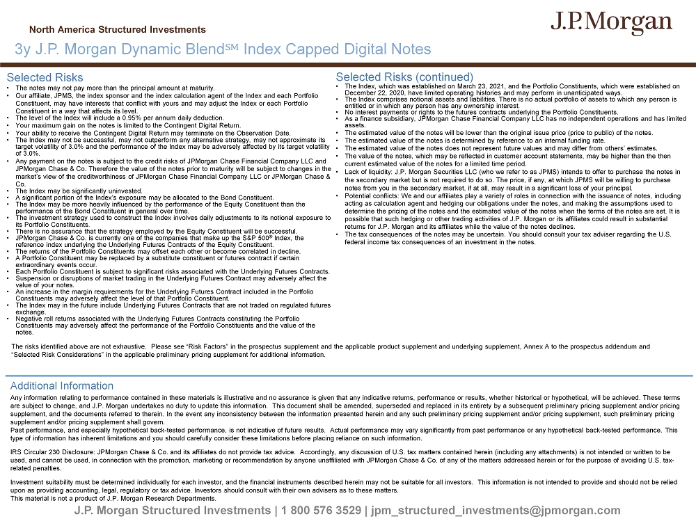 J.P. Morgan Structured Investments | 1 800 576 3529 | jpm_structured_investments@jpmorgan.com Selected Risks • The notes may not pay more than the principal amount at maturity. • Our affiliate, JPMS, the index sponsor and the index calculation agent of the Index and each Portfolio Constituent, may have interests that conflict with yours and may adjust the Index or each Portfolio Constituent in a way that affects its level. • The level of the Index will include a 0.95% per annum daily deduction. • Your maximum gain on the notes is limited to the Contingent Digital Return. • Your ability to receive the Contingent Digital Return may terminate on the Observation Date. • The Index may not be successful, may not outperform any alternative strategy, may not approximate its target volatility of 3.0% and the performance of the Index may be adversely affected by its target volatility of 3.0%. • Any payment on the notes is subject to the credit risks of JPMorgan Chase Financial Company LLC and JPMorgan Chase & Co. Therefore the value of the notes prior to maturity will be subject to changes in the market’s view of the creditworthiness of JPMorgan Chase Financial Company LLC or JPMorgan Chase & Co. • The Index may be significantly uninvested. • A significant portion of the Index’s exposure may be allocated to the Bond Constituent. • The Index may be more heavily influenced by the performance of the Equity Constituent than the performance of the Bond Constituent in general over time. • The investment strategy used to construct the Index involves daily adjustments to its notional exposure to its Portfolio Constituents. • There is no assurance that the strategy employed by the Equity Constituent will be successful. • JPMorgan Chase & Co. is currently one of the companies that make up the S&P 500 ® Index, the reference index underlying the Underlying Futures Contracts of the Equity Constituent. • The returns of the Portfolio Constituents may offset each other or become correlated in decline. • A Portfolio Constituent may be replaced by a substitute constituent or futures contract if certain extraordinary events occur. • Each Portfolio Constituent is subject to significant risks associated with the Underlying Futures Contracts. • Suspension or disruptions of market trading in the Underlying Futures Contract may adversely affect the value of your notes. • An increase in the margin requirements for the Underlying Futures Contract included in the Portfolio Constituents may adversely affect the level of that Portfolio Constituent. • The Index may in the future include Underlying Futures Contracts that are not traded on regulated futures exchange. • Negative roll returns associated with the Underlying Futures Contracts constituting the Portfolio Constituents may adversely affect the performance of the Portfolio Constituents and the value of the notes. Selected Risks (continued) • The Index, which was established on March 23, 2021, and the Portfolio Constituents, which were established on December 22, 2020, have limited operating histories and may perform in unanticipated ways. • The Index comprises notional assets and liabilities. There is no actual portfolio of assets to which any person is entitled or in which any person has any ownership interest. • No interest payments or rights to the futures contracts underlying the Portfolio Constituents. • As a finance subsidiary, JPMorgan Chase Financial Company LLC has no independent operations and has limited assets. • The estimated value of the notes will be lower than the original issue price (price to public) of the notes. • The estimated value of the notes is determined by reference to an internal funding rate. • The estimated value of the notes does not represent future values and may differ from others’ estimates. • The value of the notes, which may be reflected in customer account statements, may be higher than the then current estimated value of the notes for a limited time period. • Lack of liquidity: J.P. Morgan Securities LLC (who we refer to as JPMS) intends to offer to purchase the notes in the secondary market but is not required to do so. The price, if any, at which JPMS will be willing to purchase notes from you in the secondary market, if at all, may result in a significant loss of your principal. • Potential conflicts: We and our affiliates play a variety of roles in connection with the issuance of notes, including acting as calculation agent and hedging our obligations under the notes, and making the assumptions used to determine the pricing of the notes and the estimated value of the notes when the terms of the notes are set. It is possible that such hedging or other trading activities of J.P. Morgan or its affiliates could result in substantial returns for J.P. Morgan and its affiliates while the value of the notes declines. • The tax consequences of the notes may be uncertain. You should consult your tax adviser regarding the U.S. federal income tax consequences of an investment in the notes. Additional Information Any information relating to performance contained in these materials is illustrative and no assurance is given that any indic ati ve returns, performance or results, whether historical or hypothetical, will be achieved. These terms are subject to change, and J.P. Morgan undertakes no duty to update this information. This document shall be amended, supers ede d and replaced in its entirety by a subsequent preliminary pricing supplement and/or pricing supplement, and the documents referred to therein. In the event any inconsistency between the information presented herein an d a ny such preliminary pricing supplement and/or pricing supplement, such preliminary pricing supplement and/or pricing supplement shall govern. Past performance, and especially hypothetical back - tested performance, is not indicative of future results. Actual performance may vary significantly