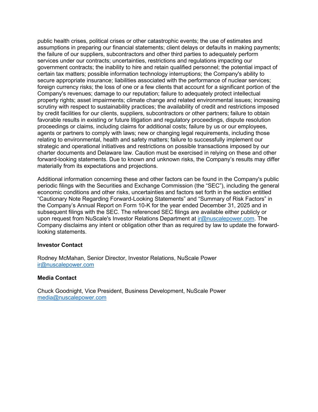 public health crises, political crises or other catastrophic events; the use of estimates and assumptions in preparing our financial statements; client delays or defaults in making payments; the failure of our suppliers, subcontractors and other third parties to adequately perform services under our contracts; uncertainties, restrictions and regulations impacting our government contracts; the inability to hire and retain qualified personnel; the potential impact of certain tax matters; possible information technology interruptions; the Company's ability to secure appropriate insurance; liabilities associated with the performance of nuclear services; foreign currency risks; the loss of one or a few clients that account for a significant portion of the Company's revenues; damage to our reputation; failure to adequately protect intellectual property rights; asset impairments; climate change and related environmental issues; increasing scrutiny with respect to sustainability practices; the availability of credit and restrictions imposed by credit facilities for our clients, suppliers, subcontractors or other partners; failure to obtain favorable results in existing or future litigation and regulatory proceedings, dispute resolution proceedings or claims, including claims for additional costs; failure by us or our employees, agents or partners to comply with laws; new or changing legal requirements, including those relating to environmental, health and safety matters; failure to successfully implement our strategic and operational initiatives and restrictions on possible transactions imposed by our charter documents and Delaware law. Caution must be exercised in relying on these and other forward-looking statements. Due to known and unknown risks, the Company’s results may differ materially from its expectations and projections. Additional information concerning these and other factors can be found in the Company's public periodic filings with the Securities and Exchange Commission (the “SEC”), including the general economic conditions and other risks, uncertainties and factors set forth in the section entitled “Cautionary Note Regarding Forward-Looking Statements” and “Summary of Risk Factors” in the Company’s Annual Report on Form 10-K for the year ended December 31, 2025 and in subsequent filings with the SEC. The referenced SEC filings are available either publicly or upon request from NuScale's Investor Relations Department at ir@nuscalepower.com. The Company disclaims any intent or obligation other than as required by law to update the forward- looking statements. Investor Contact Rodney McMahan, Senior Director, Investor Relations, NuScale Power ir@nuscalepower.com Media Contact Chuck Goodnight, Vice President, Business Development, NuScale Power media@nuscalepower.com