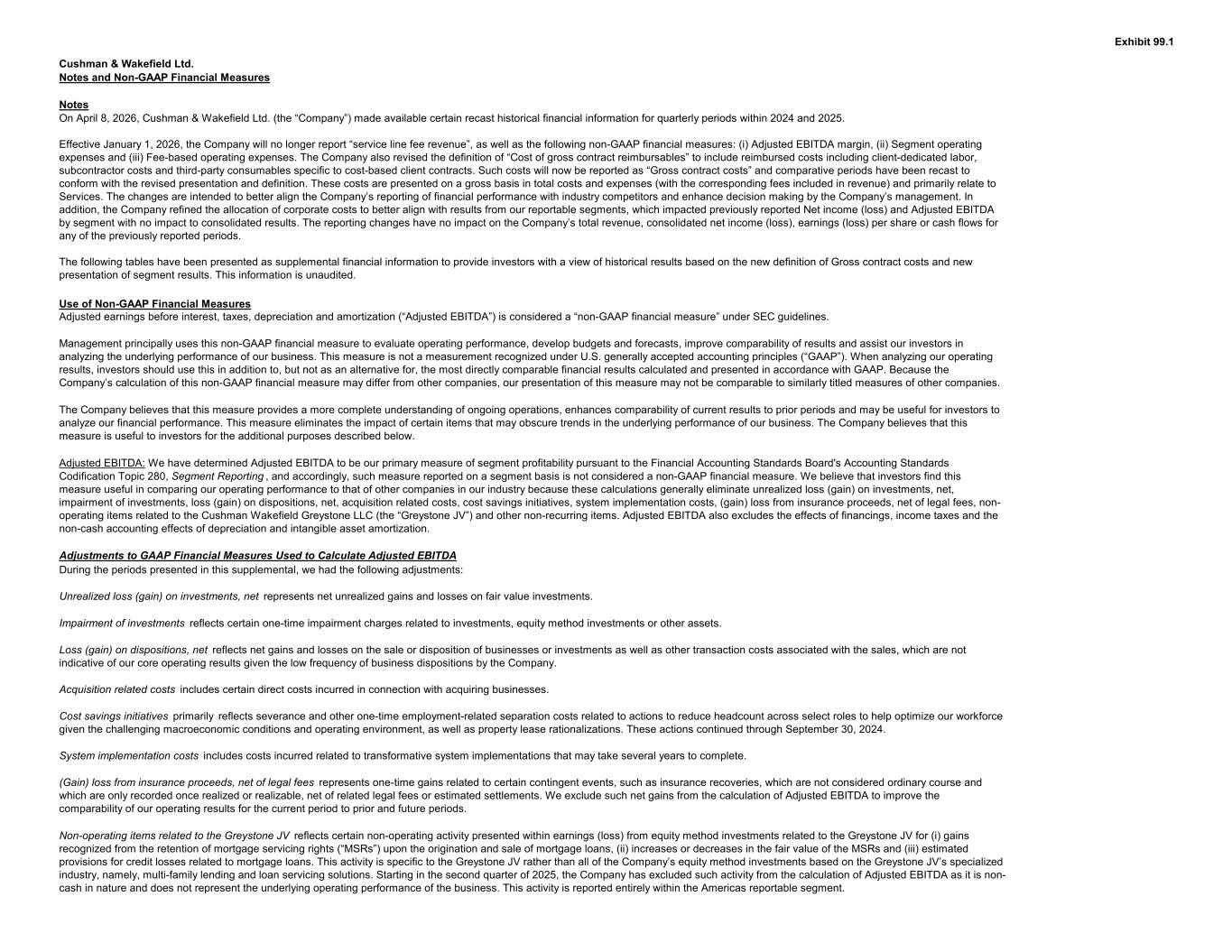 Exhibit 99.1 Cushman & Wakefield Ltd. Notes and Non-GAAP Financial Measures Notes Use of Non-GAAP Financial Measures During the periods presented in this supplemental, we had the following adjustments: Adjustments to GAAP Financial Measures Used to Calculate Adjusted EBITDA On April 8, 2026, Cushman & Wakefield Ltd. (the “Company”) made available certain recast historical financial information for quarterly periods within 2024 and 2025. Effective January 1, 2026, the Company will no longer report “service line fee revenue”, as well as the following non-GAAP financial measures: (i) Adjusted EBITDA margin, (ii) Segment operating expenses and (iii) Fee-based operating expenses. The Company also revised the definition of “Cost of gross contract reimbursables” to include reimbursed costs including client-dedicated labor, subcontractor costs and third-party consumables specific to cost-based client contracts. Such costs will now be reported as “Gross contract costs” and comparative periods have been recast to conform with the revised presentation and definition. These costs are presented on a gross basis in total costs and expenses (with the corresponding fees included in revenue) and primarily relate to Services. The changes are intended to better align the Company’s reporting of financial performance with industry competitors and enhance decision making by the Company’s management. In addition, the Company refined the allocation of corporate costs to better align with results from our reportable segments, which impacted previously reported Net income (loss) and Adjusted EBITDA by segment with no impact to consolidated results. The reporting changes have no impact on the Company’s total revenue, consolidated net income (loss), earnings (loss) per share or cash flows for any of the previously reported periods. The following tables have been presented as supplemental financial information to provide investors with a view of historical results based on the new definition of Gross contract costs and new presentation of segment results. This information is unaudited. Adjusted earnings before interest, taxes, depreciation and amortization (“Adjusted EBITDA”) is considered a “non-GAAP financial measure” under SEC guidelines. Management principally uses this non-GAAP financial measure to evaluate operating performance, develop budgets and forecasts, improve comparability of results and assist our investors in analyzing the underlying performance of our business. This measure is not a measurement recognized under U.S. generally accepted accounting principles (“GAAP”). When analyzing our operating results, investors should use this in addition to, but not as an alternative for, the most directly comparable financial results calculated and presented in accordance with GAAP. Because the Company’s calculation of this non-GAAP financial measure may differ from other companies, our presentation of this measure may not be comparable to similarly titled measures of other companies. The Company believes that this measure provides a more complete understanding of ongoing operations, enhances comparability of current results to prior periods and may be useful for investors to analyze our financial performance. This measure eliminates the impact of certain items that may obscure trends in the underlying performance of our business. The Company believes that this measure is useful to investors for the additional purposes described below. Adjusted EBITDA: We have determined Adjusted EBITDA to be our primary measure of segment profitability pursuant to the Financial Accounting Standards Board's Accounting Standards Codification Topic 280, Segment Reporting , and accordingly, such measure reported on a segment basis is not considered a non-GAAP financial measure. We believe that investors find this measure useful in comparing our operating performance to that of other companies in our industry because these calculations generally eliminate unrealized loss (gain) on investments, net, impairment of investments, loss (gain) on dispositions, net, acquisition related costs, cost savings initiatives, system implementation costs, (gain) loss from insurance proceeds, net of legal fees, non- operating items related to the Cushman Wakefield Greystone LLC (the “Greystone JV”) and other non-recurring items. Adjusted EBITDA also excludes the effects of financings, income taxes and the non-cash accounting effects of depreciation and intangible asset amortization. (Gain) loss from insurance proceeds, net of legal fees represents one-time gains related to certain contingent events, such as insurance recoveries, which are not considered ordinary course and which are only recorded once realized or realizable, net of related legal fees or estimated settlements. We exclude such net gains from the calculation of Adjusted EBITDA to improve the comparability of our operating results for the current period to prior and future periods. Non-operating items related to the Greystone JV reflects certain non-operating activity presented within earnings (loss) from equity method investments related to the Greystone JV for (i) gains recognized from the retention of mortgage servicing rights (“MSRs”) upon the origination and sale of mortgage loans, (ii) increases or decreases in the fair value of the MSRs and (iii) estimated provisions for credit losses related to mortgage loans. This activity is specific to the Greystone JV rather than all of the Company’s equity method investments based on the Greystone JV’s specialized industry, namely, multi-family lending and loan servicing solutions. Starting in the second quarter of 2025, the Company has excluded such activity from the calculation of Adjusted EBITDA as it is non- cash in nature and does not represent the underlying operating performance of the business. This activity is reported entirely within the Americas reportable segment. Unrealized loss (g