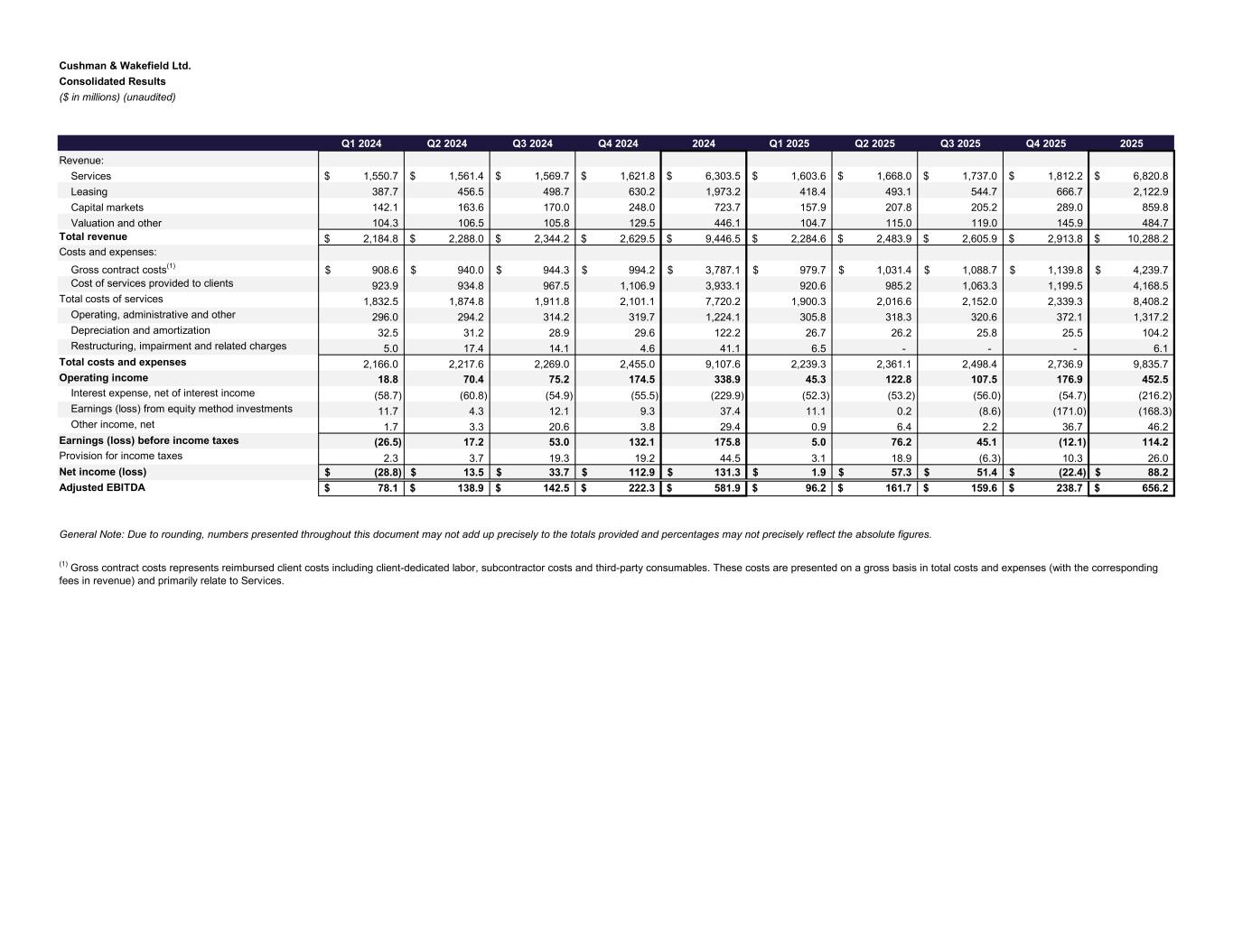 Cushman & Wakefield Ltd. Consolidated Results ($ in millions) (unaudited) Q1 2024 Q2 2024 Q3 2024 Q4 2024 2024 Q1 2025 Q2 2025 Q3 2025 Q4 2025 2025 Revenue: Services 1,550.7$ 1,561.4$ 1,569.7$ 1,621.8$ 6,303.5$ 1,603.6$ 1,668.0$ 1,737.0$ 1,812.2$ 6,820.8$ Leasing 387.7 456.5 498.7 630.2 1,973.2 418.4 493.1 544.7 666.7 2,122.9 Capital markets 142.1 163.6 170.0 248.0 723.7 157.9 207.8 205.2 289.0 859.8 Valuation and other 104.3 106.5 105.8 129.5 446.1 104.7 115.0 119.0 145.9 484.7 Total revenue 2,184.8$ 2,288.0$ 2,344.2$ 2,629.5$ 9,446.5$ 2,284.6$ 2,483.9$ 2,605.9$ 2,913.8$ 10,288.2$ Costs and expenses: Gross contract costs(1) 908.6$ 940.0$ 944.3$ 994.2$ 3,787.1$ 979.7$ 1,031.4$ 1,088.7$ 1,139.8$ 4,239.7$ Cost of services provided to clients 923.9 934.8 967.5 1,106.9 3,933.1 920.6 985.2 1,063.3 1,199.5 4,168.5 Total costs of services 1,832.5 1,874.8 1,911.8 2,101.1 7,720.2 1,900.3 2,016.6 2,152.0 2,339.3 8,408.2 Operating, administrative and other 296.0 294.2 314.2 319.7 1,224.1 305.8 318.3 320.6 372.1 1,317.2 Depreciation and amortization 32.5 31.2 28.9 29.6 122.2 26.7 26.2 25.8 25.5 104.2 Restructuring, impairment and related charges 5.0 17.4 14.1 4.6 41.1 6.5 - - - 6.1 Total costs and expenses 2,166.0 2,217.6 2,269.0 2,455.0 9,107.6 2,239.3 2,361.1 2,498.4 2,736.9 9,835.7 Operating income 18.8 70.4 75.2 174.5 338.9 45.3 122.8 107.5 176.9 452.5 Interest expense, net of interest income (58.7) (60.8) (54.9) (55.5) (229.9) (52.3) (53.2) (56.0) (54.7) (216.2) Earnings (loss) from equity method investments 11.7 4.3 12.1 9.3 37.4 11.1 0.2 (8.6) (171.0) (168.3) Other income, net 1.7 3.3 20.6 3.8 29.4 0.9 6.4 2.2 36.7 46.2 Earnings (loss) before income taxes (26.5) 17.2 53.0 132.1 175.8 5.0 76.2 45.1 (12.1) 114.2 Provision for income taxes 2.3 3.7 19.3 19.2 44.5 3.1 18.9 (6.3) 10.3 26.0 Net income (loss) (28.8)$ 13.5$ 33.7$ 112.9$ 131.3$ 1.9$ 57.3$ 51.4$ (22.4)$ 88.2$ Adjusted EBITDA 78.1$ 138.9$ 142.5$ 222.3$ 581.9$ 96.2$ 161.7$ 159.6$ 238.7$ 656.2$ General Note: Due to rounding, numbers presented throughout this document may not add up precisely to the totals provided and percentages may not precisely reflect the absolute figures. (1) Gross contract costs represents reimbursed client costs including client-dedicated labor, subcontractor costs and third-party consumables. These costs are presented on a gross basis in total costs and expenses (with the corresponding fees in revenue) and primarily relate to Services.