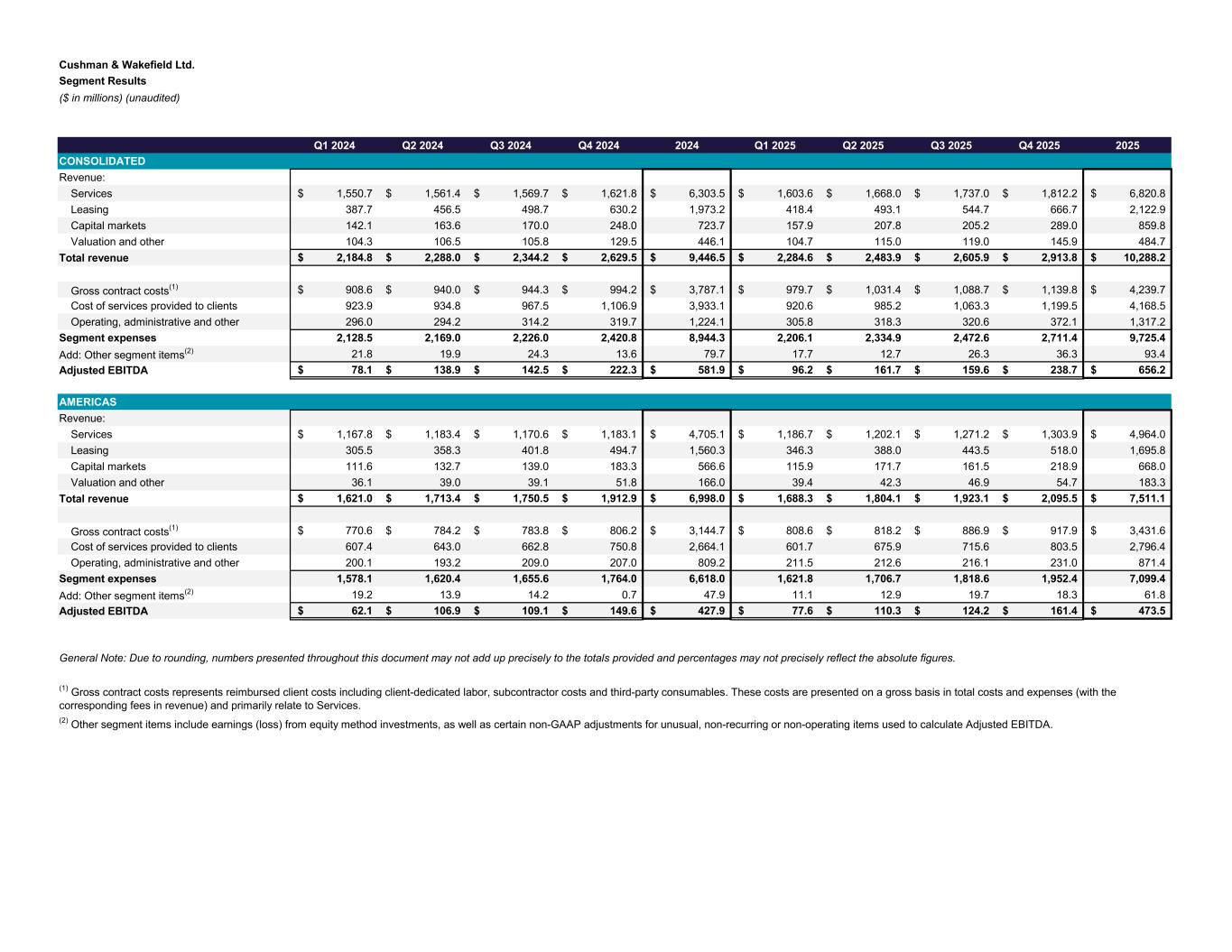 Cushman & Wakefield Ltd. Segment Results ($ in millions) (unaudited) Q1 2024 Q2 2024 Q3 2024 Q4 2024 2024 Q1 2025 Q2 2025 Q3 2025 Q4 2025 2025 CONSOLIDATED Revenue: Services 1,550.7$ 1,561.4$ 1,569.7$ 1,621.8$ 6,303.5$ 1,603.6$ 1,668.0$ 1,737.0$ 1,812.2$ 6,820.8$ Leasing 387.7 456.5 498.7 630.2 1,973.2 418.4 493.1 544.7 666.7 2,122.9 Capital markets 142.1 163.6 170.0 248.0 723.7 157.9 207.8 205.2 289.0 859.8 Valuation and other 104.3 106.5 105.8 129.5 446.1 104.7 115.0 119.0 145.9 484.7 Total revenue 2,184.8$ 2,288.0$ 2,344.2$ 2,629.5$ 9,446.5$ 2,284.6$ 2,483.9$ 2,605.9$ 2,913.8$ 10,288.2$ Gross contract costs(1) 908.6$ 940.0$ 944.3$ 994.2$ 3,787.1$ 979.7$ 1,031.4$ 1,088.7$ 1,139.8$ 4,239.7$ Cost of services provided to clients 923.9 934.8 967.5 1,106.9 3,933.1 920.6 985.2 1,063.3 1,199.5 4,168.5 Operating, administrative and other 296.0 294.2 314.2 319.7 1,224.1 305.8 318.3 320.6 372.1 1,317.2 Segment expenses 2,128.5 2,169.0 2,226.0 2,420.8 8,944.3 2,206.1 2,334.9 2,472.6 2,711.4 9,725.4 Add: Other segment items(2) 21.8 19.9 24.3 13.6 79.7 17.7 12.7 26.3 36.3 93.4 Adjusted EBITDA 78.1$ 138.9$ 142.5$ 222.3$ 581.9$ 96.2$ 161.7$ 159.6$ 238.7$ 656.2$ AMERICAS Revenue: Services 1,167.8$ 1,183.4$ 1,170.6$ 1,183.1$ 4,705.1$ 1,186.7$ 1,202.1$ 1,271.2$ 1,303.9$ 4,964.0$ Leasing 305.5 358.3 401.8 494.7 1,560.3 346.3 388.0 443.5 518.0 1,695.8 Capital markets 111.6 132.7 139.0 183.3 566.6 115.9 171.7 161.5 218.9 668.0 Valuation and other 36.1 39.0 39.1 51.8 166.0 39.4 42.3 46.9 54.7 183.3 Total revenue 1,621.0$ 1,713.4$ 1,750.5$ 1,912.9$ 6,998.0$ 1,688.3$ 1,804.1$ 1,923.1$ 2,095.5$ 7,511.1$ Gross contract costs(1) 770.6$ 784.2$ 783.8$ 806.2$ 3,144.7$ 808.6$ 818.2$ 886.9$ 917.9$ 3,431.6$ Cost of services provided to clients 607.4 643.0 662.8 750.8 2,664.1 601.7 675.9 715.6 803.5 2,796.4 Operating, administrative and other 200.1 193.2 209.0 207.0 809.2 211.5 212.6 216.1 231.0 871.4 Segment expenses 1,578.1 1,620.4 1,655.6 1,764.0 6,618.0 1,621.8 1,706.7 1,818.6 1,952.4 7,099.4 Add: Other segment items(2) 19.2 13.9 14.2 0.7 47.9 11.1 12.9 19.7 18.3 61.8 Adjusted EBITDA 62.1$ 106.9$ 109.1$ 149.6$ 427.9$ 77.6$ 110.3$ 124.2$ 161.4$ 473.5$ General Note: Due to rounding, numbers presented throughout this document may not add up precisely to the totals provided and percentages may not precisely reflect the absolute figures. (2) Other segment items include earnings (loss) from equity method investments, as well as certain non-GAAP adjustments for unusual, non-recurring or non-operating items used to calculate Adjusted EBITDA. (1) Gross contract costs represents reimbursed client costs including client-dedicated labor, subcontractor costs and third-party consumables. These costs are presented on a gross basis in total costs and expenses (with the corresponding fees in revenue) and primarily relate to Services.