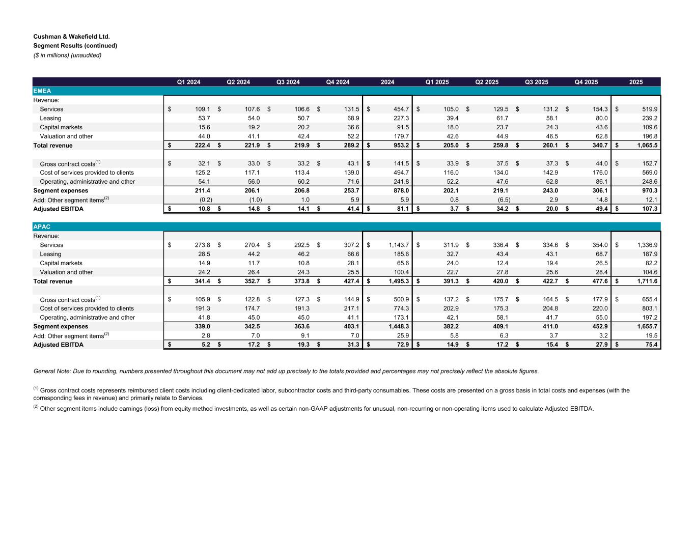 Cushman & Wakefield Ltd. Segment Results (continued) ($ in millions) (unaudited) Q1 2024 Q2 2024 Q3 2024 Q4 2024 2024 Q1 2025 Q2 2025 Q3 2025 Q4 2025 2025 EMEA Revenue: Services 109.1$ 107.6$ 106.6$ 131.5$ 454.7$ 105.0$ 129.5$ 131.2$ 154.3$ 519.9$ Leasing 53.7 54.0 50.7 68.9 227.3 39.4 61.7 58.1 80.0 239.2 Capital markets 15.6 19.2 20.2 36.6 91.5 18.0 23.7 24.3 43.6 109.6 Valuation and other 44.0 41.1 42.4 52.2 179.7 42.6 44.9 46.5 62.8 196.8 Total revenue 222.4$ 221.9$ 219.9$ 289.2$ 953.2$ 205.0$ 259.8$ 260.1$ 340.7$ 1,065.5$ Gross contract costs(1) 32.1$ 33.0$ 33.2$ 43.1$ 141.5$ 33.9$ 37.5$ 37.3$ 44.0$ 152.7$ Cost of services provided to clients 125.2 117.1 113.4 139.0 494.7 116.0 134.0 142.9 176.0 569.0 Operating, administrative and other 54.1 56.0 60.2 71.6 241.8 52.2 47.6 62.8 86.1 248.6 Segment expenses 211.4 206.1 206.8 253.7 878.0 202.1 219.1 243.0 306.1 970.3 Add: Other segment items(2) (0.2) (1.0) 1.0 5.9 5.9 0.8 (6.5) 2.9 14.8 12.1 Adjusted EBITDA 10.8$ 14.8$ 14.1$ 41.4$ 81.1$ 3.7$ 34.2$ 20.0$ 49.4$ 107.3$ APAC Revenue: Services 273.8$ 270.4$ 292.5$ 307.2$ 1,143.7$ 311.9$ 336.4$ 334.6$ 354.0$ 1,336.9$ Leasing 28.5 44.2 46.2 66.6 185.6 32.7 43.4 43.1 68.7 187.9 Capital markets 14.9 11.7 10.8 28.1 65.6 24.0 12.4 19.4 26.5 82.2 Valuation and other 24.2 26.4 24.3 25.5 100.4 22.7 27.8 25.6 28.4 104.6 Total revenue 341.4$ 352.7$ 373.8$ 427.4$ 1,495.3$ 391.3$ 420.0$ 422.7$ 477.6$ 1,711.6$ Gross contract costs(1) 105.9$ 122.8$ 127.3$ 144.9$ 500.9$ 137.2$ 175.7$ 164.5$ 177.9$ 655.4$ Cost of services provided to clients 191.3 174.7 191.3 217.1 774.3 202.9 175.3 204.8 220.0 803.1 Operating, administrative and other 41.8 45.0 45.0 41.1 173.1 42.1 58.1 41.7 55.0 197.2 Segment expenses 339.0 342.5 363.6 403.1 1,448.3 382.2 409.1 411.0 452.9 1,655.7 Add: Other segment items(2) 2.8 7.0 9.1 7.0 25.9 5.8 6.3 3.7 3.2 19.5 Adjusted EBITDA 5.2$ 17.2$ 19.3$ 31.3$ 72.9$ 14.9$ 17.2$ 15.4$ 27.9$ 75.4$ General Note: Due to rounding, numbers presented throughout this document may not add up precisely to the totals provided and percentages may not precisely reflect the absolute figures. (2) Other segment items include earnings (loss) from equity method investments, as well as certain non-GAAP adjustments for unusual, non-recurring or non-operating items used to calculate Adjusted EBITDA. (1) Gross contract costs represents reimbursed client costs including client-dedicated labor, subcontractor costs and third-party consumables. These costs are presented on a gross basis in total costs and expenses (with the corresponding fees in revenue) and primarily relate to Services.
