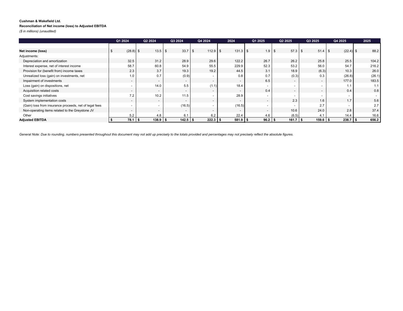 Cushman & Wakefield Ltd. Reconciliation of Net income (loss) to Adjusted EBITDA ($ in millions) (unaudited) Q1 2024 Q2 2024 Q3 2024 Q4 2024 2024 Q1 2025 Q2 2025 Q3 2025 Q4 2025 2025 Net income (loss) (28.8)$ 13.5$ 33.7$ 112.9$ 131.3$ 1.9$ 57.3$ 51.4$ (22.4)$ 88.2$ Adjustments: Depreciation and amortization 32.5 31.2 28.9 29.6 122.2 26.7 26.2 25.8 25.5 104.2 Interest expense, net of interest income 58.7 60.8 54.9 55.5 229.9 52.3 53.2 56.0 54.7 216.2 Provision for (benefit from) income taxes 2.3 3.7 19.3 19.2 44.5 3.1 18.9 (6.3) 10.3 26.0 Unrealized loss (gain) on investments, net 1.0 0.7 (0.9) - 0.8 0.7 (0.3) 0.3 (26.8) (26.1) Impairment of investments - - - - - 6.5 - - 177.0 183.5 Loss (gain) on dispositions, net - 14.0 5.5 (1.1) 18.4 - - - 1.1 1.1 Acquisition related costs - - - - - 0.4 - - 0.4 0.8 Cost savings initiatives 7.2 10.2 11.5 - 28.9 - - - - - System implementation costs - - - - - - 2.3 1.6 1.7 5.6 (Gain) loss from insurance proceeds, net of legal fees - - (16.5) - (16.5) - - 2.7 - 2.7 Non-operating items related to the Greystone JV - - - - - - 10.6 24.0 2.8 37.4 Other 5.2 4.8 6.1 6.2 22.4 4.6 (6.5) 4.1 14.4 16.6 Adjusted EBITDA 78.1$ 138.9$ 142.5$ 222.3$ 581.9$ 96.2$ 161.7$ 159.6$ 238.7$ 656.2$ General Note: Due to rounding, numbers presented throughout this document may not add up precisely to the totals provided and percentages may not precisely reflect the absolute figures.