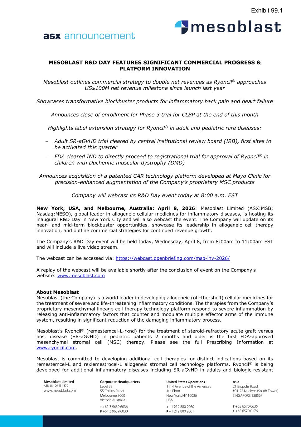 MESOBLAST R&D DAY FEATURES SIGNIFICANT COMMERCIAL PROGRESS & PLATFORM INNOVATION Mesoblast outlines commercial strategy to double net revenues as Ryoncil® approaches US$100M net revenue milestone since launch last year Showcases transformative blockbuster products for inflammatory back pain and heart failure Announces close of enrollment for Phase 3 trial for CLBP at the end of this month Highlights label extension strategy for Ryoncil® in adult and pediatric rare diseases: − Adult SR-aGvHD trial cleared by central institutional review board (IRB), first sites to be activated this quarter − FDA cleared IND to directly proceed to registrational trial for approval of Ryoncil® in children with Duchenne muscular dystrophy (DMD) Announces acquisition of a patented CAR technology platform developed at Mayo Clinic for precision-enhanced augmentation of the Company’s proprietary MSC products Company will webcast its R&D Day event today at 8:00 a.m. EST New York, USA, and Melbourne, Australia: April 8, 2026: Mesoblast Limited (ASX:MSB; Nasdaq:MESO), global leader in allogeneic cellular medicines for inflammatory diseases, is hosting its inaugural R&D Day in New York City and will also webcast the event. The Company will update on its near- and mid-term blockbuster opportunities, showcase its leadership in allogeneic cell therapy innovation, and outline commercial strategies for continued revenue growth. The Company’s R&D Day event will be held today, Wednesday, April 8, from 8:00am to 11:00am EST and will include a live video stream. The webcast can be accessed via: https://webcast.openbriefing.com/msb-inv-2026/ A replay of the webcast will be available shortly after the conclusion of event on the Company’s website: www.mesoblast.com About Mesoblast Mesoblast (the Company) is a world leader in developing allogeneic (off-the-shelf) cellular medicines for the treatment of severe and life-threatening inflammatory conditions. The therapies from the Company’s proprietary mesenchymal lineage cell therapy technology platform respond to severe inflammation by releasing anti-inflammatory factors that counter and modulate multiple effector arms of the immune system, resulting in significant reduction of the damaging inflammatory process. Mesoblast’s Ryoncil® (remestemcel-L-rknd) for the treatment of steroid-refractory acute graft versus host disease (SR-aGvHD) in pediatric patients 2 months and older is the first FDA-approved mesenchymal stromal cell (MSC) therapy. Please see the full Prescribing Information at www.ryoncil.com. Mesoblast is committed to developing additional cell therapies for distinct indications based on its remestemcel-L and rexlemestrocel-L allogeneic stromal cell technology platforms. Ryoncil® is being developed for additional inflammatory diseases including SR-aGvHD in adults and biologic-resistant Exhibit 99.1