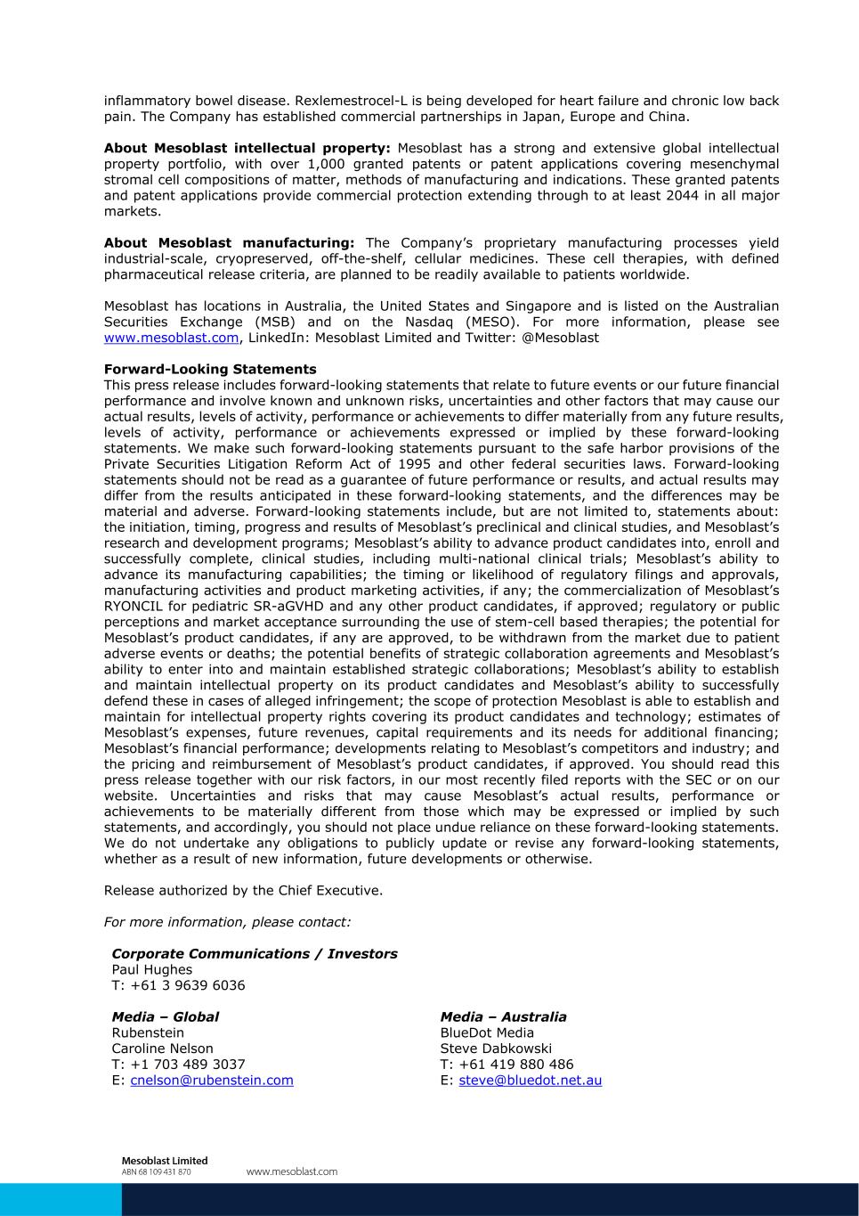 inflammatory bowel disease. Rexlemestrocel-L is being developed for heart failure and chronic low back pain. The Company has established commercial partnerships in Japan, Europe and China. About Mesoblast intellectual property: Mesoblast has a strong and extensive global intellectual property portfolio, with over 1,000 granted patents or patent applications covering mesenchymal stromal cell compositions of matter, methods of manufacturing and indications. These granted patents and patent applications provide commercial protection extending through to at least 2044 in all major markets. About Mesoblast manufacturing: The Company’s proprietary manufacturing processes yield industrial-scale, cryopreserved, off-the-shelf, cellular medicines. These cell therapies, with defined pharmaceutical release criteria, are planned to be readily available to patients worldwide. Mesoblast has locations in Australia, the United States and Singapore and is listed on the Australian Securities Exchange (MSB) and on the Nasdaq (MESO). For more information, please see www.mesoblast.com, LinkedIn: Mesoblast Limited and Twitter: @Mesoblast Forward-Looking Statements This press release includes forward-looking statements that relate to future events or our future financial performance and involve known and unknown risks, uncertainties and other factors that may cause our actual results, levels of activity, performance or achievements to differ materially from any future results, levels of activity, performance or achievements expressed or implied by these forward-looking statements. We make such forward-looking statements pursuant to the safe harbor provisions of the Private Securities Litigation Reform Act of 1995 and other federal securities laws. Forward-looking statements should not be read as a guarantee of future performance or results, and actual results may differ from the results anticipated in these forward-looking statements, and the differences may be material and adverse. Forward-looking statements include, but are not limited to, statements about: the initiation, timing, progress and results of Mesoblast’s preclinical and clinical studies, and Mesoblast’s research and development programs; Mesoblast’s ability to advance product candidates into, enroll and successfully complete, clinical studies, including multi-national clinical trials; Mesoblast’s ability to advance its manufacturing capabilities; the timing or likelihood of regulatory filings and approvals, manufacturing activities and product marketing activities, if any; the commercialization of Mesoblast’s RYONCIL for pediatric SR-aGVHD and any other product candidates, if approved; regulatory or public perceptions and market acceptance surrounding the use of stem-cell based therapies; the potential for Mesoblast’s product candidates, if any are approved, to be withdrawn from the market due to patient adverse events or deaths; the potential benefits of strategic collaboration agreements and Mesoblast’s ability to enter into and maintain established strategic collaborations; Mesoblast’s ability to establish and maintain intellectual property on its product candidates and Mesoblast’s ability to successfully defend these in cases of alleged infringement; the scope of protection Mesoblast is able to establish and maintain for intellectual property rights covering its product candidates and technology; estimates of Mesoblast’s expenses, future revenues, capital requirements and its needs for additional financing; Mesoblast’s financial performance; developments relating to Mesoblast’s competitors and industry; and the pricing and reimbursement of Mesoblast’s product candidates, if approved. You should read this press release together with our risk factors, in our most recently filed reports with the SEC or on our website. Uncertainties and risks that may cause Mesoblast’s actual results, performance or achievements to be materially different from those which may be expressed or implied by such statements, and accordingly, you should not place undue reliance on these forward-looking statements. We do not undertake any obligations to publicly update or revise any forward-looking statements, whether as a result of new information, future developments or otherwise. Release authorized by the Chief Executive. For more information, please contact: Corporate Communications / Investors Paul Hughes T: +61 3 9639 6036 Media – Global Media – Australia Rubenstein BlueDot Media Caroline Nelson Steve Dabkowski T: +1 703 489 3037 T: +61 419 880 486 E: cnelson@rubenstein.com E: steve@bluedot.net.au