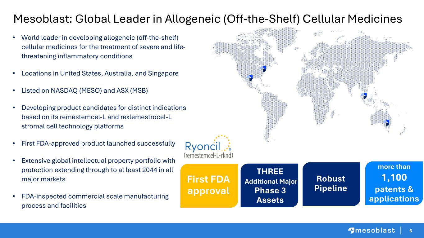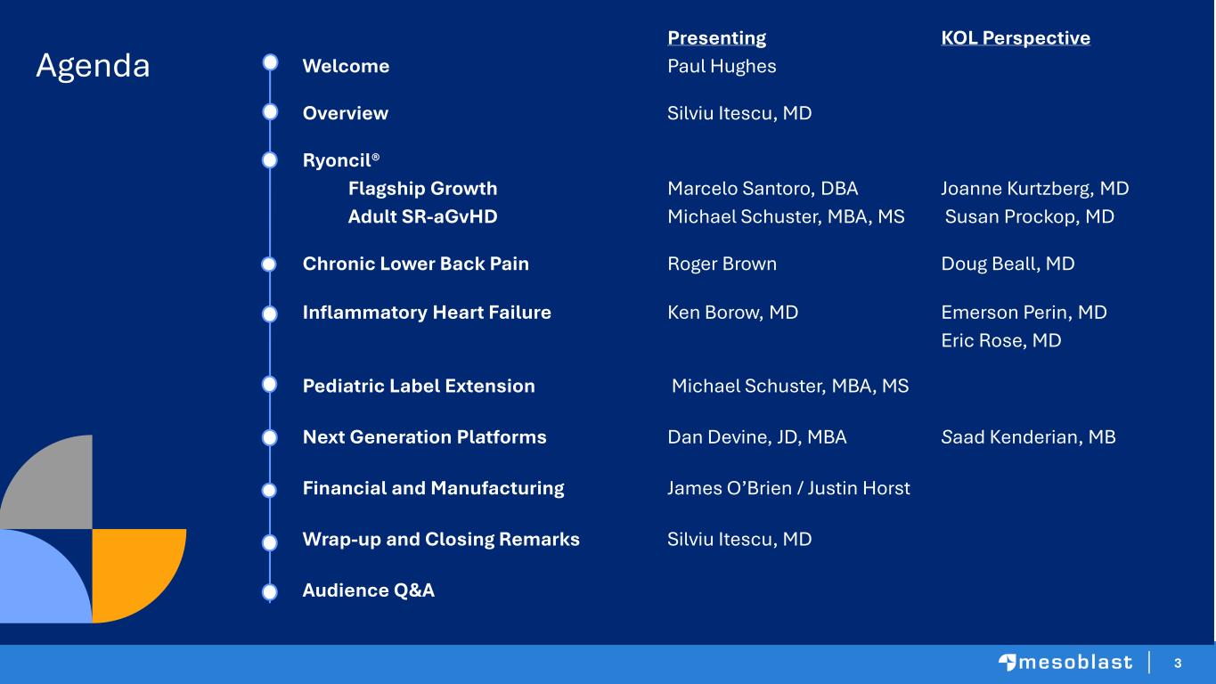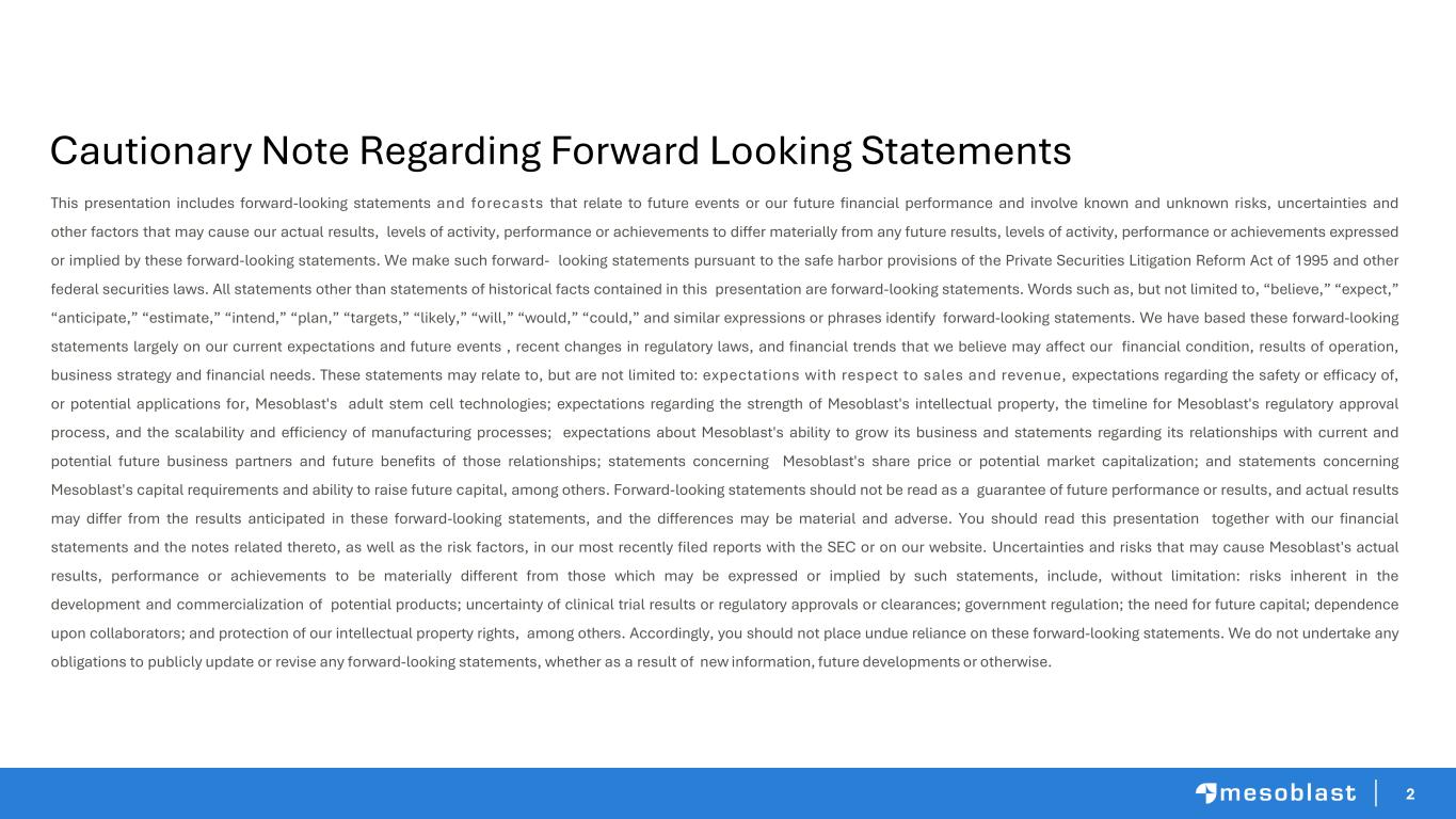 2 This presentation includes forward-looking statements and forecasts that relate to future events or our future financial performance and involve known and unknown risks, uncertainties and other factors that may cause our actual results, levels of activity, performance or achievements to differ materially from any future results, levels of activity, performance or achievements expressed or implied by these forward-looking statements. We make such forward- looking statements pursuant to the safe harbor provisions of the Private Securities Litigation Reform Act of 1995 and other federal securities laws. All statements other than statements of historical facts contained in this presentation are forward-looking statements. Words such as, but not limited to, “believe,” “expect,” “anticipate,” “estimate,” “intend,” “plan,” “targets,” “likely,” “will,” “would,” “could,” and similar expressions or phrases identify forward-looking statements. We have based these forward-looking statements largely on our current expectations and future events , recent changes in regulatory laws, and financial trends that we believe may affect our financial condition, results of operation, business strategy and financial needs. These statements may relate to, but are not limited to: expectations with respect to sales and revenue, expectations regarding the safety or efficacy of, or potential applications for, Mesoblast's adult stem cell technologies; expectations regarding the strength of Mesoblast's intellectual property, the timeline for Mesoblast's regulatory approval process, and the scalability and efficiency of manufacturing processes; expectations about Mesoblast's ability to grow its business and statements regarding its relationships with current and potential future business partners and future benefits of those relationships; statements concerning Mesoblast's share price or potential market capitalization; and statements concerning Mesoblast's capital requirements and ability to raise future capital, among others. Forward-looking statements should not be read as a guarantee of future performance or results, and actual results may differ from the results anticipated in these forward-looking statements, and the differences may be material and adverse. You should read this presentation together with our financial statements and the notes related thereto, as well as the risk factors, in our most recently filed reports with the SEC or on our website. Uncertainties and risks that may cause Mesoblast's actual results, performance or achievements to be materially different from those which may be expressed or implied by such statements, include, without limitation: risks inherent in the development and commercialization of potential products; uncertainty of clinical trial results or regulatory approvals or clearances; government regulation; the need for future capital; dependence upon collaborators; and protection of our intellectual property rights, among others. Accordingly, you should not place undue reliance on these forward-looking statements. We do not undertake any obligations to publicly update or revise any forward-looking statements, whether as a result of new information, future developments or otherwise. Cautionary Note Regarding Forward Looking Statements