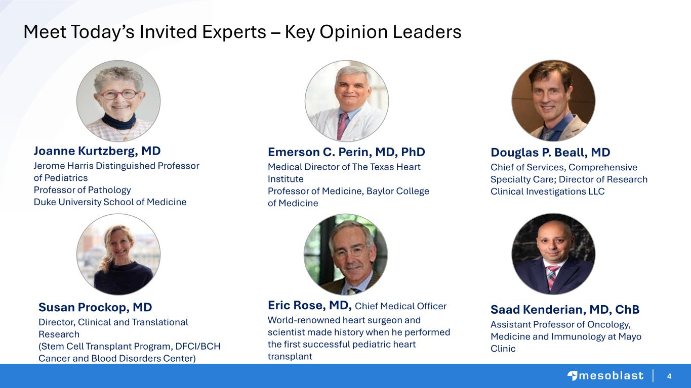 3 Presenting KOL Perspective Welcome Paul Hughes Overview Silviu Itescu, MD Ryoncil® Flagship Growth Marcelo Santoro, DBA Joanne Kurtzberg, MD Adult SR-aGvHD Michael Schuster, MBA, MS Susan Prockop, MD Chronic Lower Back Pain Roger Brown Doug Beall, MD Inflammatory Heart Failure Ken Borow, MD Emerson Perin, MD Eric Rose, MD Pediatric Label Extension Michael Schuster, MBA, MS Next Generation Platforms Dan Devine, JD, MBA Saad Kenderian, MB Financial and Manufacturing James O’Brien / Justin Horst Wrap-up and Closing Remarks Silviu Itescu, MD Audience Q&A Agenda