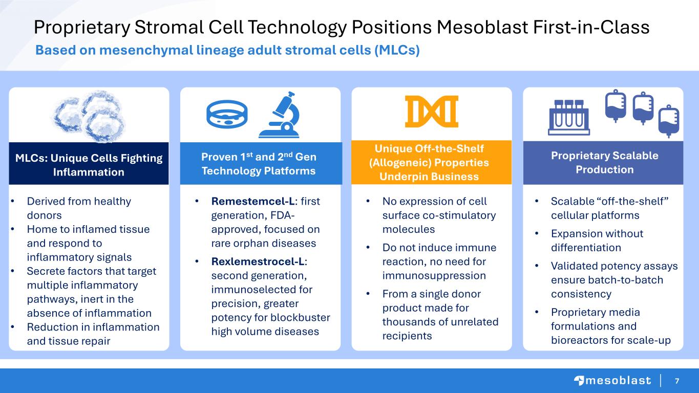 6 Mesoblast: Global Leader in Allogeneic (Off-the-Shelf) Cellular Medicines First FDA approval more than 1,100 patents & applications Robust Pipeline • World leader in developing allogeneic (off-the-shelf) cellular medicines for the treatment of severe and life- threatening inflammatory conditions • Locations in United States, Australia, and Singapore • Listed on NASDAQ (MESO) and ASX (MSB) • Developing product candidates for distinct indications based on its remestemcel-L and rexlemestrocel-L stromal cell technology platforms • First FDA-approved product launched successfully • Extensive global intellectual property portfolio with protection extending through to at least 2044 in all major markets • FDA-inspected commercial scale manufacturing process and facilities THREE Additional Major Phase 3 Assets