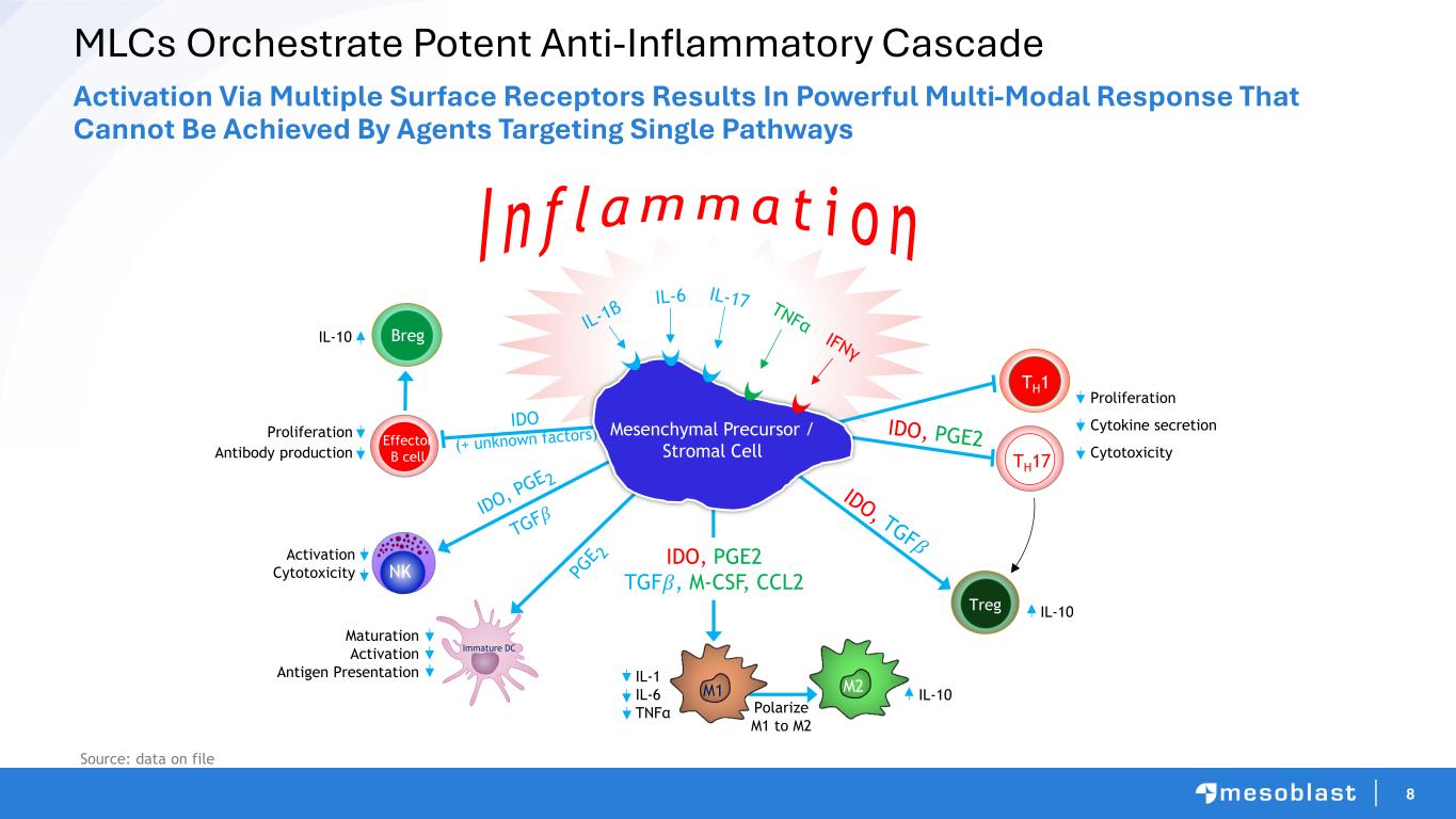 7 Proprietary Stromal Cell Technology Positions Mesoblast First-in-Class MLCs Derived from healthy bone marrow Home to inflamed tissue and respond to inflammatory signals Secrete factors thattarget multiple inflammatory pathways, inert in the absence of inflammation Reduction in inflammation and tissue repair Based on mesenchymal lineage adult stromal cells (MLCs) • Derived from healthy donors • Home to inflamed tissue and respond to inflammatory signals • Secrete factors that target multiple inflammatory pathways, inert in the absence of inflammation • Reduction in infla mation and tissue repair • Remestemcel-L: first generation, FDA- approved, focused on rare orphan diseases • Rexlemestrocel-L: second generation, immunoselected for precision, greater potency for blockbuster high volume diseases • No expression of cell surface co-stimulatory molecules • Do not induce immune reaction, no need for immunosuppression • From a single donor product made for thousands of unrelated recipients • Scalable “off-the-shelf” cellular platforms • Expansion without differentiation • Validated potency assays ensure batch-to-batch consistency • Proprietary media formulations and bioreactors for scale-up MLCs: Unique Cells Fighting Inflammation Proven 1st and 2nd Gen Technology Platforms Unique Off-the-Shelf (Allogeneic) Properties Underpin Business Proprietary Scalable Production