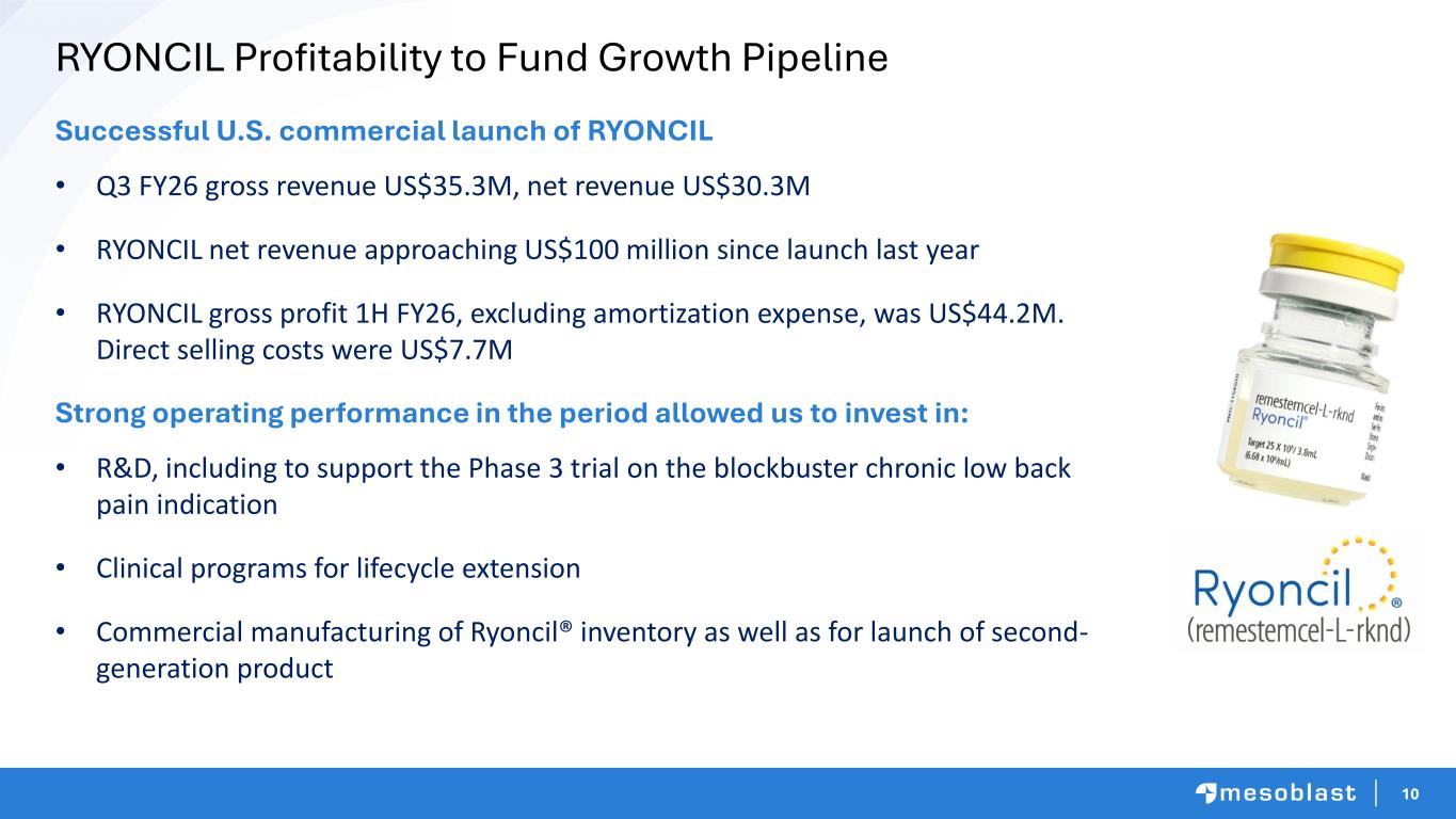 9 Mesoblast First-In-Class Leader in Allogeneic Cellular Therapies Ryoncil® Only FDA Approved MSC, Successful First US Launch Net revenue approaching US$100M since launch last year Highly profitable single product on stand-alone basis Proceeds from revenue generated is being re-invested in label extensions studies and blockbuster opportunities Pipeline with Multiple Blockbuster Opportunities Phase 3 programs position rexlemestrocel-L to transform the treatment of low back pain with degenerative disc disease, and inflammatory heart failure Phase 3 programs to extend Ryoncil® label to adult aGvHD and pediatric rare diseases such as Duchenne Muscular Dystrophy Commercial Capability Established Infrastructure to support product launches across multiple expansion indications Built specialized sales team focused on hospitals, transplant centers, and specialists