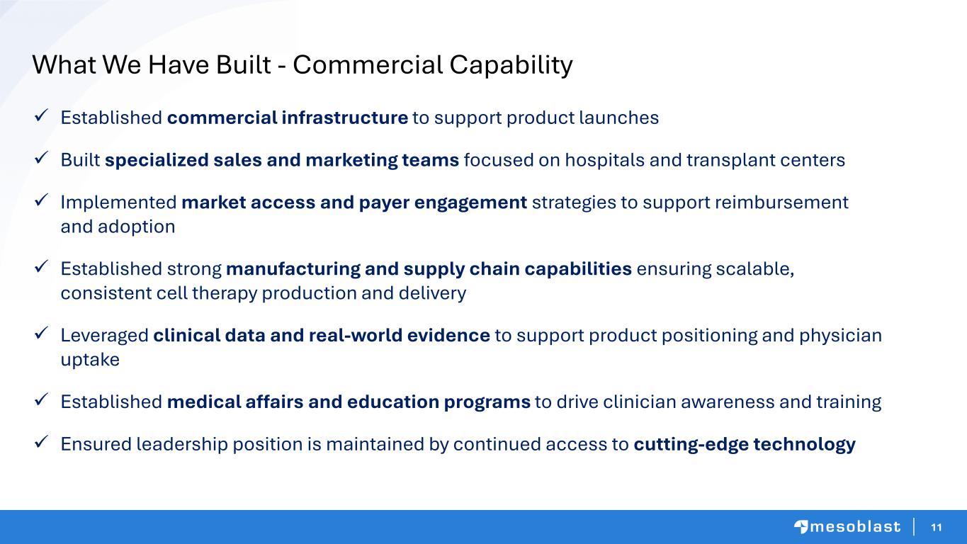 10 RYONCIL Profitability to Fund Growth Pipeline Successful U.S. commercial launch of RYONCIL • Q3 FY26 gross revenue US$35.3M, net revenue US$30.3M • RYONCIL net revenue approaching US$100 million since launch last year • RYONCIL gross profit 1H FY26, excluding amortization expense, was US$44.2M. Direct selling costs were US$7.7M Strong operating performance in the period allowed us to invest in: • R&D, including to support the Phase 3 trial on the blockbuster chronic low back pain indication • Clinical programs for lifecycle extension • Commercial manufacturing of Ryoncil® inventory as well as for launch of second- generation product
