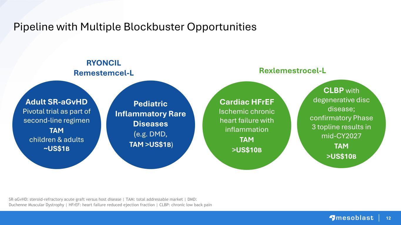 11 What We Have Built - Commercial Capability ✓ Established commercial infrastructure to support product launches ✓ Built specialized sales and marketing teams focused on hospitals and transplant centers ✓ Implemented market access and payer engagement strategies to support reimbursement and adoption ✓ Established strong manufacturing and supply chain capabilities ensuring scalable, consistent cell therapy production and delivery ✓ Leveraged clinical data and real-world evidence to support product positioning and physician uptake ✓ Established medical affairs and education programs to drive clinician awareness and training ✓ Ensured leadership position is maintained by continued access to cutting-edge technology