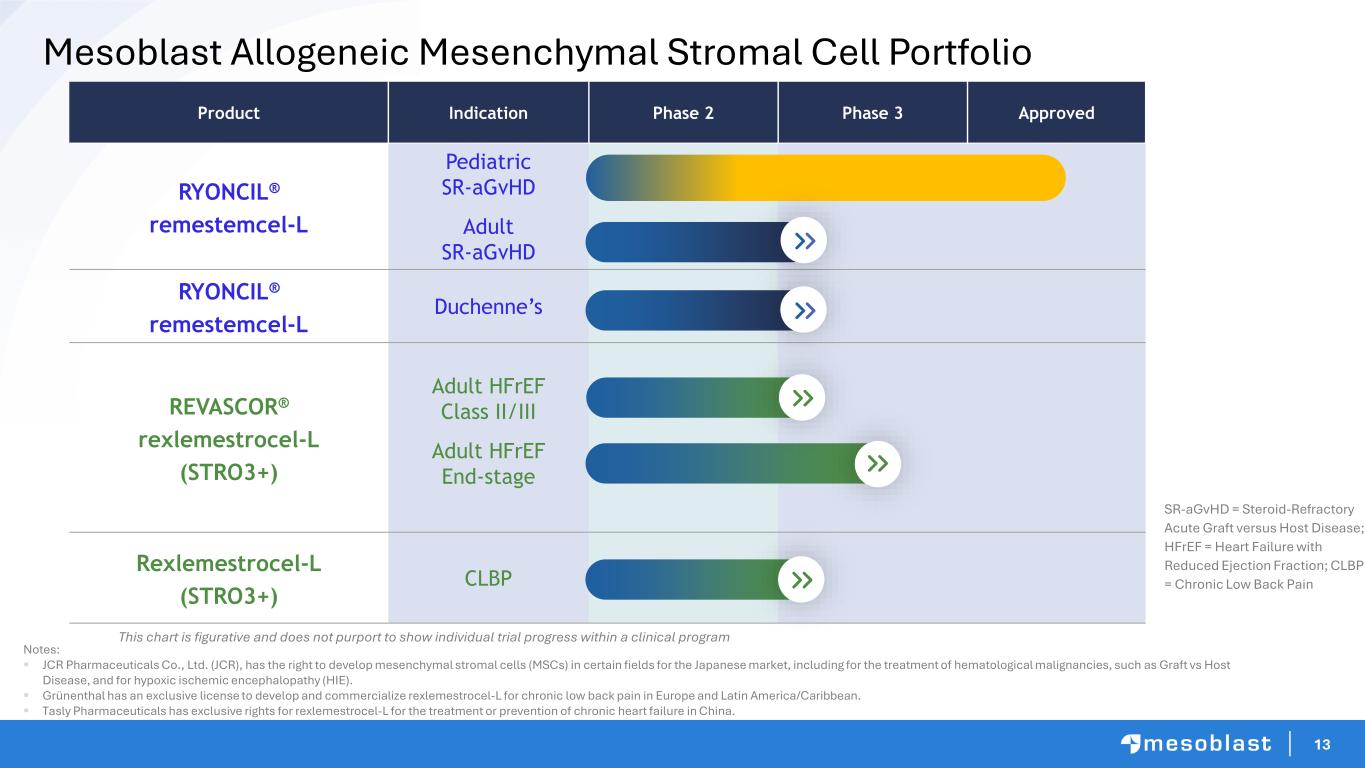 12 Pipeline with Multiple Blockbuster Opportunities Adult SR-aGvHD Pivotal trial as part of second-line regimen TAM children & adults ~US$1B Cardiac HFrEF Ischemic chronic heart failure with inflammation TAM >US$10B CLBP with degenerative disc disease; confirmatory Phase 3 topline results in mid-CY2027 TAM >US$10B RYONCIL Remestemcel-L Rexlemestrocel-L Pediatric Inflammatory Rare Diseases (e.g. DMD, TAM >US$1B) SR-aGvHD: steroid-refractory acute graft versus host disease | TAM: total addressable market | DMD: Duchenne Muscular Dystrophy | HFrEF: heart failure reduced ejection fraction | CLBP: chronic low back pain