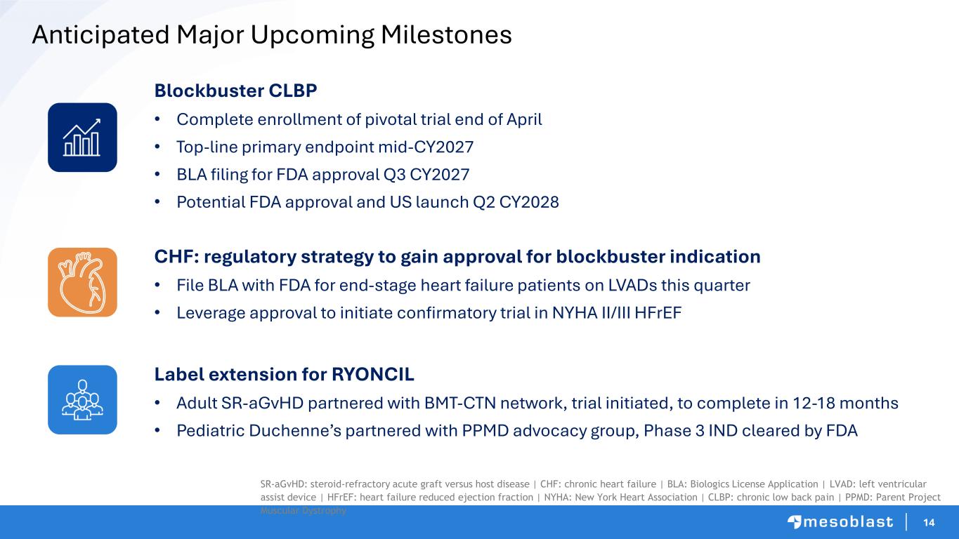 13 Mesoblast Allogeneic Mesenchymal Stromal Cell Portfolio Product Indication Phase 2 Phase 3 Approved RYONCIL® remestemcel-L Pediatric SR-aGvHD Adult SR-aGvHD RYONCIL® remestemcel-L Duchenne’s REVASCOR® rexlemestrocel-L (STRO3+) Adult HFrEF Class II/III Adult HFrEF End-stage Rexlemestrocel-L (STRO3+) CLBP SR-aGvHD = Steroid-Refractory Acute Graft versus Host Disease; HFrEF = Heart Failure with Reduced Ejection Fraction; CLBP = Chronic Low Back Pain This chart is figurative and does not purport to show individual trial progress within a clinical program Notes: ▪ JCR Pharmaceuticals Co., Ltd. (JCR), has the right to develop mesenchymal stromal cells (MSCs) in certain fields for the Japanese market, including for the treatment of hematological malignancies, such as Graft vs Host Disease, and for hypoxic ischemic encephalopathy (HIE). ▪ Grünenthal has an exclusive license to develop and commercialize rexlemestrocel-L for chronic low back pain in Europe and Latin America/Caribbean. ▪ Tasly Pharmaceuticals has exclusive rights for rexlemestrocel-L for the treatment or prevention of chronic heart failure in China.