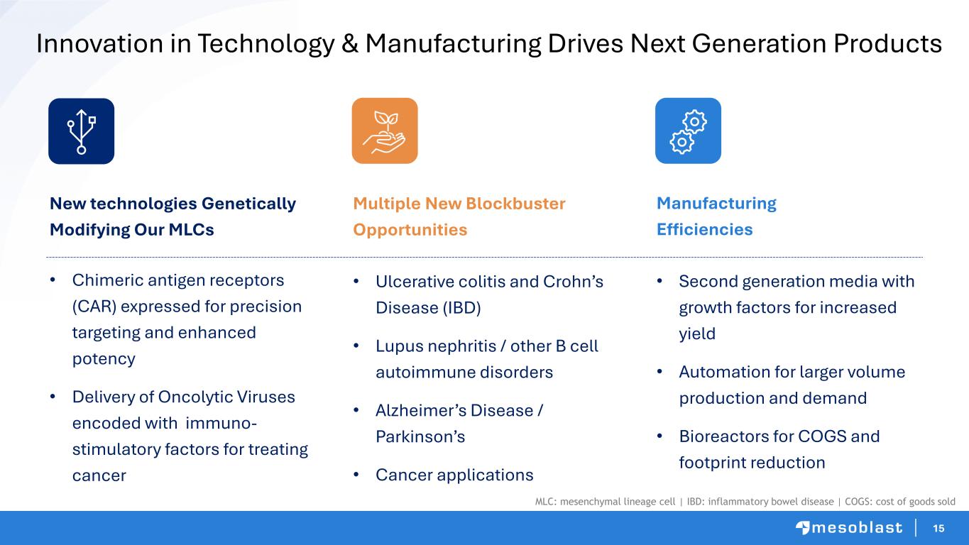 14 Anticipated Major Upcoming Milestones Blockbuster CLBP • Complete enrollment of pivotal trial end of April • Top-line primary endpoint mid-CY2027 • BLA filing for FDA approval Q3 CY2027 • Potential FDA approval and US launch Q2 CY2028 CHF: regulatory strategy to gain approval for blockbuster indication • File BLA with FDA for end-stage heart failure patients on LVADs this quarter • Leverage approval to initiate confirmatory trial in NYHA II/III HFrEF Label extension for RYONCIL • Adult SR-aGvHD partnered with BMT-CTN network, trial initiated, to complete in 12-18 months • Pediatric Duchenne’s partnered with PPMD advocacy group, Phase 3 IND cleared by FDA SR-aGvHD: steroid-refractory acute graft versus host disease | CHF: chronic heart failure | BLA: Biologics License Application | LVAD: left ventricular assist device | HFrEF: heart failure reduced ejection fraction | NYHA: New York Heart Association | CLBP: chronic low back pain | PPMD: Parent Project Muscular Dystrophy