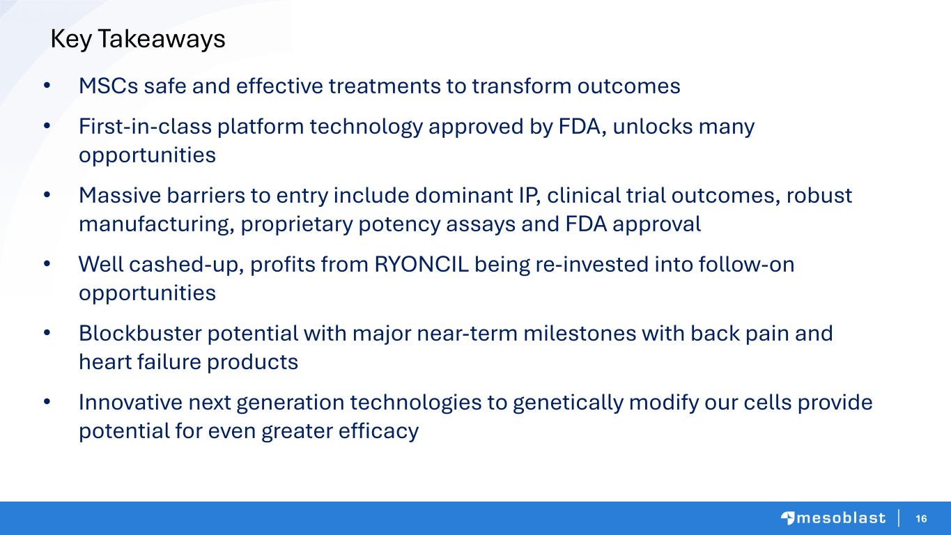 15 Innovation in Technology & Manufacturing Drives Next Generation Products New technologies Genetically Modifying Our MLCs • Chimeric antigen receptors (CAR) expressed for precision targeting and enhanced potency • Delivery of Oncolytic Viruses encoded with immuno- stimulatory factors for treating cancer Multiple New Blockbuster Opportunities • Ulcerative colitis and Crohn’s Disease (IBD) • Lupus nephritis / other B cell autoimmune disorders • Alzheimer’s Disease / Parkinson’s • Cancer applications Manufacturing Efficiencies • Second generation media with growth factors for increased yield • Automation for larger volume production and demand • Bioreactors for COGS and footprint reduction MLC: mesenchymal lineage cell | IBD: inflammatory bowel disease | COGS: cost of goods sold