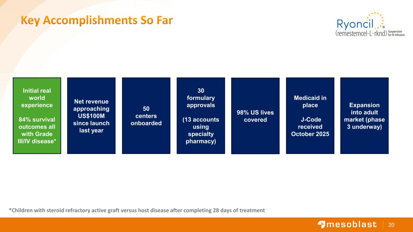 19 Successful First Year of RYONCIL • Ryoncil is transforming outcomes in pediatric SR-aGvHD, with strong positive feedback from treating physicians • Commercial uptake has exceeded expectations, outperforming benchmarks from comparable successful launches • We have established the capability to scale, with a clear path to doubling our US revenue from RYONCIL • Adult indication represents a major opportunity, representing a 3-fold increase in TAM and revenue potential