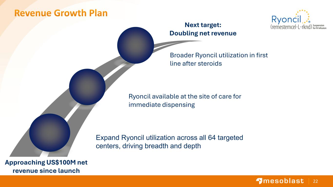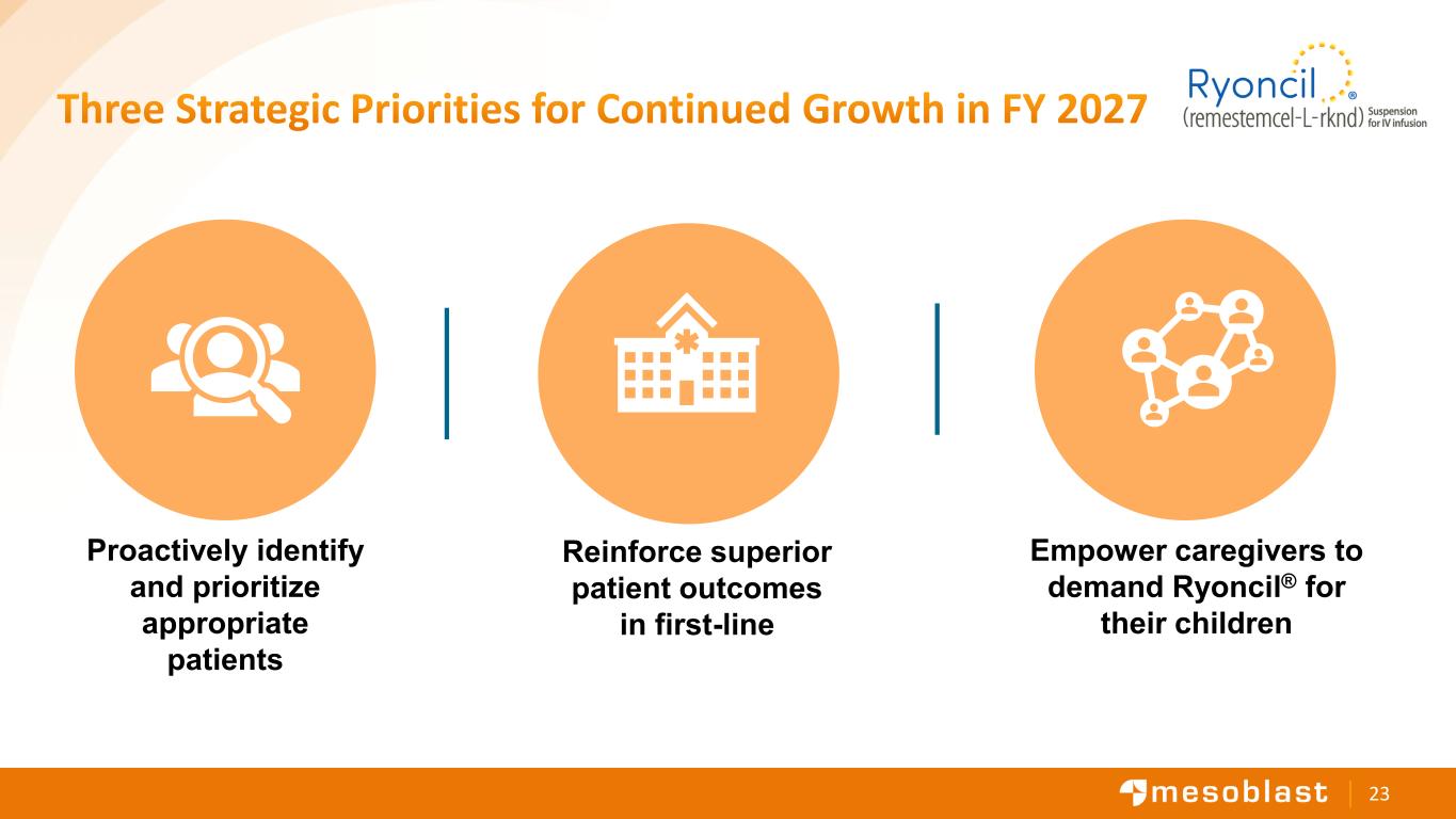 22 Revenue Growth Plan Next target: Doubling net revenue Approaching US$100M net revenue since launch Expand Ryoncil utilization across all 64 targeted centers, driving breadth and depth Ryoncil available at the site of care for immediate dispensing Broader Ryoncil utilization in first line after steroids