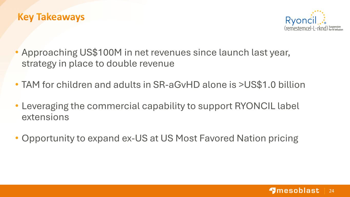 23 Three Strategic Priorities for Continued Growth in FY 2027 Empower caregivers to demand Ryoncil® for their children Reinforce superior patient outcomes in first-line Proactively identify and prioritize appropriate patients