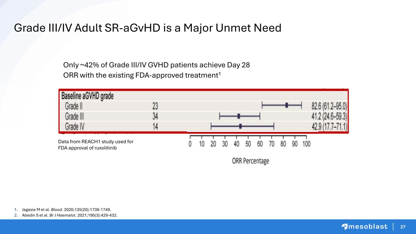 26 Beyond 2027, First-line Treatment in Adult SR-aGvHD is a Huge Opportunity for RYONCIL Growth Approx. 50% of all SR- aGvHD are Grade III/IV Market size in adults is ~3x larger than pediatric ~50% overlap Adult and pediatric centers Existing pediatric KAM/MSLs and infrastructure can be leveraged and expanded to commercialize adult GVHD Pricing structure maintained given high mortality risk and orphan population