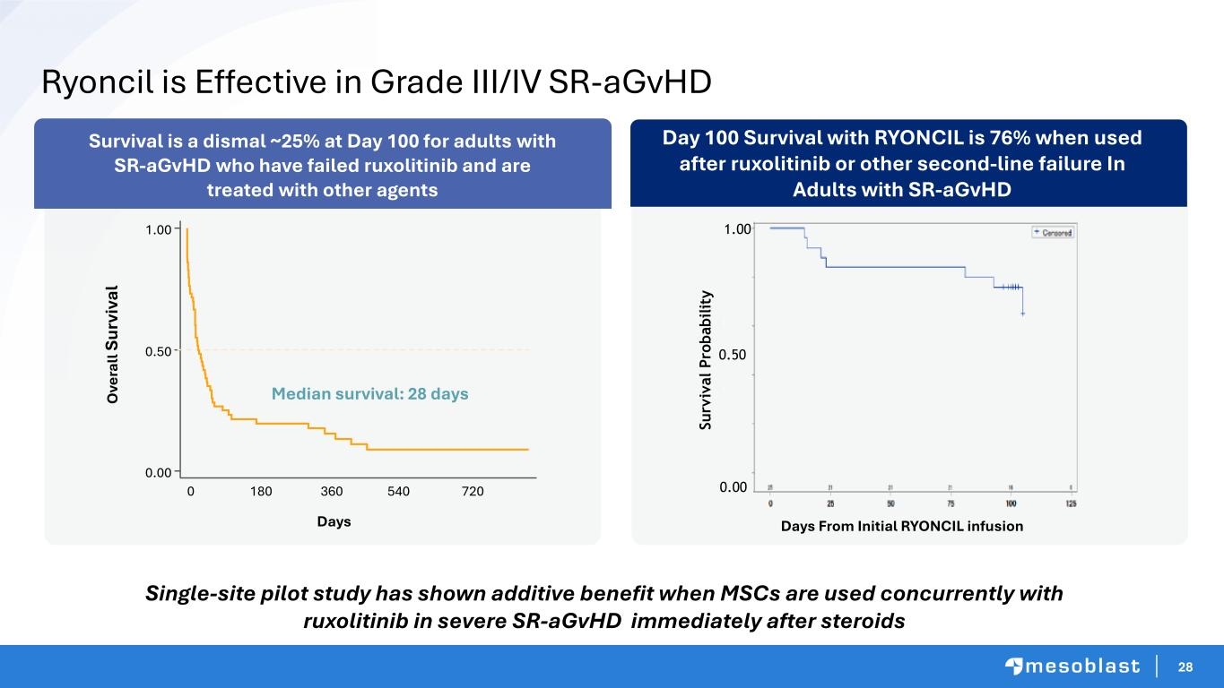 27 1. Jagasia M et al. Blood. 2020;135(20):1739-1749. 2. Abedin S et al. Br J Haematol. 2021;195(3):429-432. Only ~42% of Grade III/IV GVHD patients achieve Day 28 ORR with the existing FDA-approved treatment1 Data from REACH1 study used for FDA approval of ruxolitinib Grade III/IV Adult SR-aGvHD is a Major Unmet Need