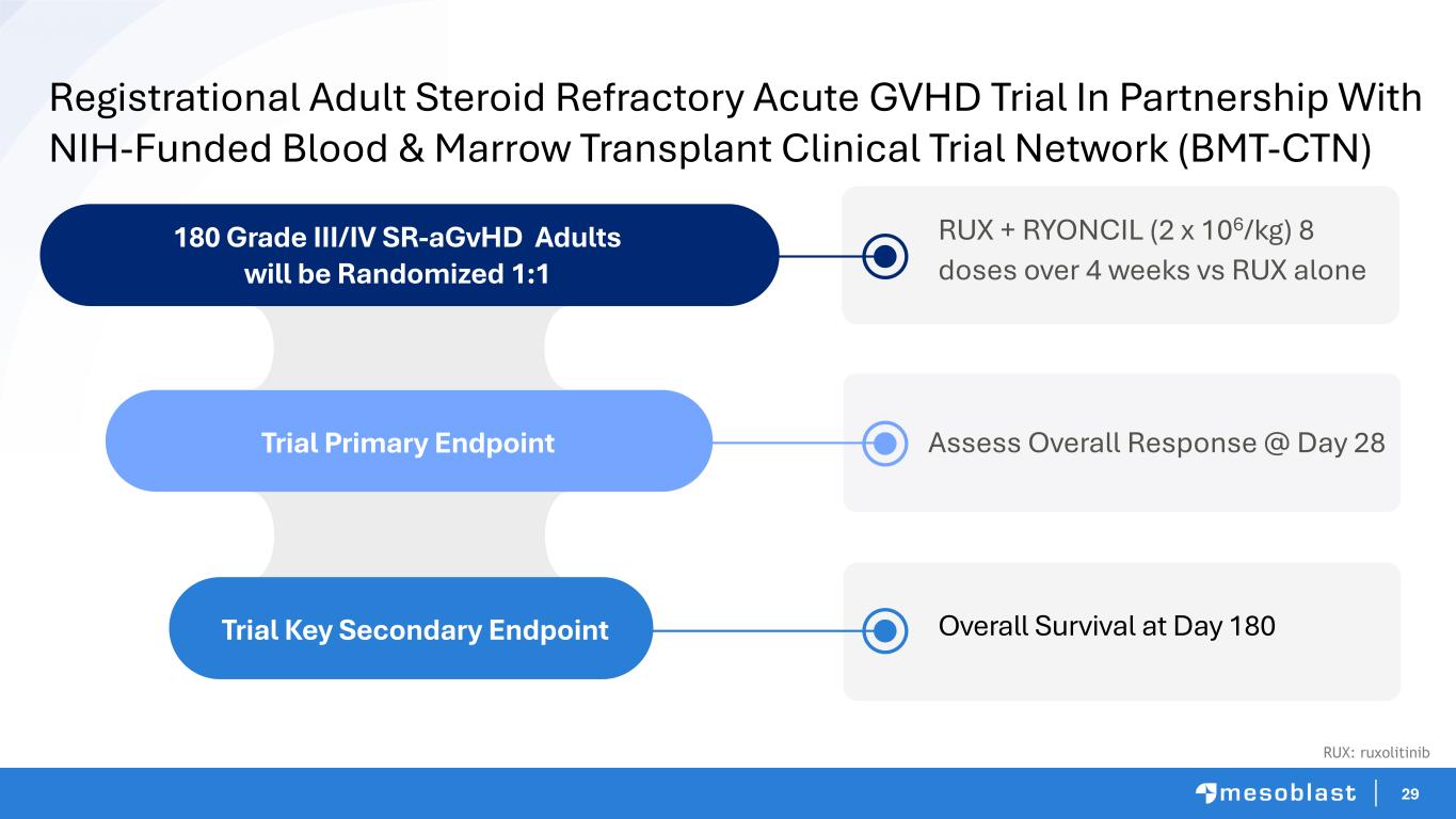 28 Day 100 Survival with RYONCIL is 76% when used after ruxolitinib or other second-line failure In Adults with SR-aGvHD 0 180 540 720 Days 360 0.00 0.50 1.00 O ve ra ll Su rv iv al Median survival: 28 days Days From Initial RYONCIL infusion S u rv iv a l P ro b a b il it y 0.00 0.50 1.00 Ryoncil is Effective in Grade III/IV SR-aGvHD Survival is a dismal ~25% at Day 100 for adults with SR-aGvHD who have failed ruxolitinib and are treated with other agents Single-site pilot study has shown additive benefit when MSCs are used concurrently with ruxolitinib in severe SR-aGvHD immediately after steroids