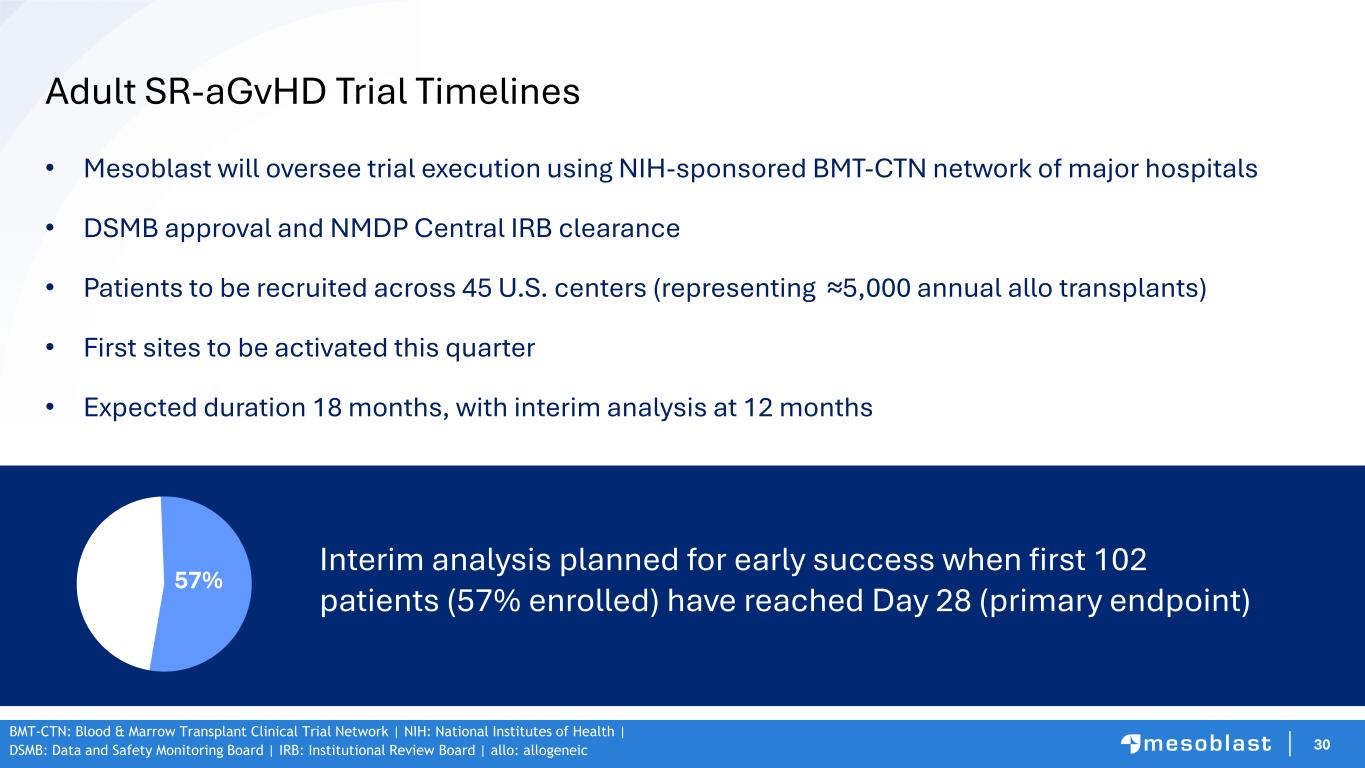 29 Registrational Adult Steroid Refractory Acute GVHD Trial In Partnership With NIH-Funded Blood & Marrow Transplant Clinical Trial Network (BMT-CTN) 180 Grade III/IV SR-aGvHD Adults will be Randomized 1:1 Trial Key Secondary Endpoint Trial Primary Endpoint Assess Overall Response @ Day 28 RUX + RYONCIL (2 x 106/kg) 8 doses over 4 weeks vs RUX alone Overall Survival at Day 180 RUX: ruxolitinib