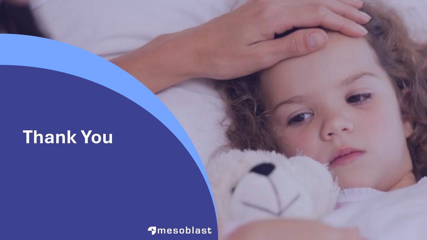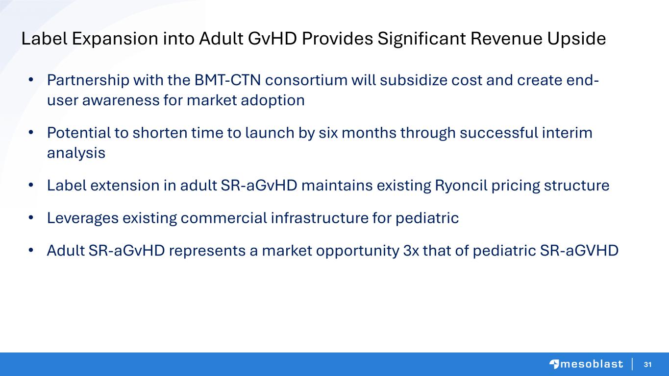 30 • Mesoblast will oversee trial execution using NIH-sponsored BMT-CTN network of major hospitals • DSMB approval and NMDP Central IRB clearance • Patients to be recruited across 45 U.S. centers (representing ≈5,000 annual allo transplants) • First sites to be activated this quarter • Expected duration 18 months, with interim analysis at 12 months Adult SR-aGvHD Trial Timelines Interim analysis planned for early success when first 102 patients (57% enrolled) have reached Day 28 (primary endpoint) 57% BMT-CTN: Blood & Marrow Transplant Clinical Trial Network | NIH: National Institutes of Health | DSMB: Data and Safety Monitoring Board | IRB: Institutional Review Board | allo: allogeneic