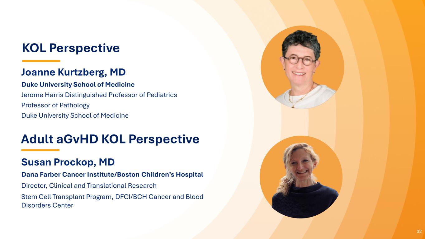 31 • Partnership with the BMT-CTN consortium will subsidize cost and create end- user awareness for market adoption • Potential to shorten time to launch by six months through successful interim analysis • Label extension in adult SR-aGvHD maintains existing Ryoncil pricing structure • Leverages existing commercial infrastructure for pediatric • Adult SR-aGvHD represents a market opportunity 3x that of pediatric SR-aGVHD Label Expansion into Adult GvHD Provides Significant Revenue Upside