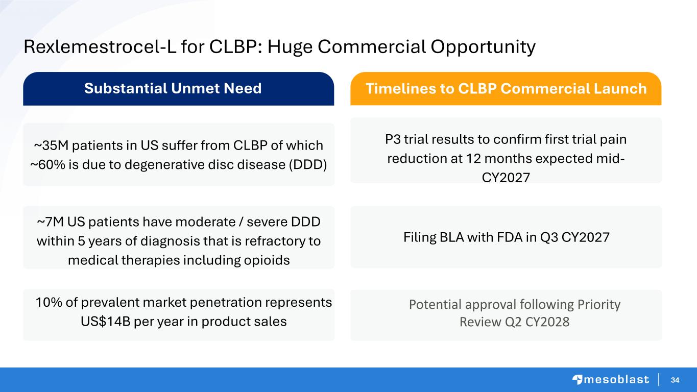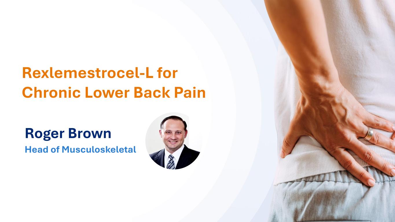 33 Jess, this is the commercial section – per our call: • Orange bar on the bottom – pls keep for all slides in this section • Header text: please keep the same color for each slide • Logos: please keep as placed (even if a duplicate on the slides) • Slide 16 icons: ok to drop in size • Slide 17-18: please keep same box colors • Slide 19: glad for an alternative image • These notes apply to slides 13 – 23 • Ok to swap the font Rexlemestrocel-L for Chronic Lower Back Pain Roger Brown Head of Musculoskeletal